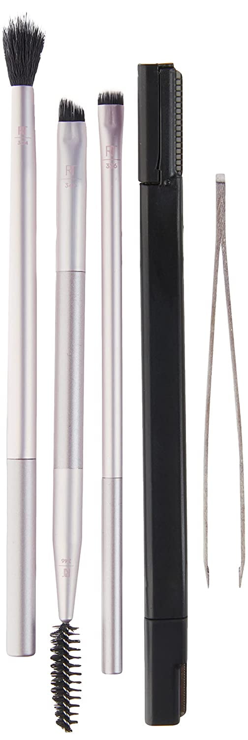 For Eyeshadow + Liner + BrowShape, Fill and PerfectGet Fully Naturally Beautiful Brows! 100% VeganCruelty FreeThe Brush, Blend, Brow 5pc Gift Set gives you everything you need to find your perfect shape. Get full, naturally beautiful brows! Kit includes:RT 304 Defining Crease BrushRT 326 Flat Liner BrushRT 346 Angled Brow Brush + SpoolieTweezersBrow RazorRT 304 Defining Crease BrushUltra-tapered bristlesPrecisely blends cream or powder shadowsRT 326 Flat LinerStraight edgeExtend eyeliner past eye lid TweezersStainless steel angles tipPrecisely extract undesired hairs from the eyebrowRT 346 Angled Brow Brush + Spoolie Angled cut head for a precision applicationSpoolie for blending and shapingUse with cream or powder brow productBrow RazorDual sided precision razorRemove fine hairs on the face and expertly shape your browReal Techniques Blush, Blend, Brow Kit includes: (1) RT 304 Defining Crease Brush,(1) RT 326 Flat Liner Brush, (1) RT 346 Angled Brow Brush Spoolie, (1) Tweezers, and (1) Brow Razor,Real Techniques Blush, Blend, Brow Kit gives you naturally beautiful brows!,RT 304 defining crease brush has ultra tapered bristles to precisely blend creams and powder shadows,RT 326 flat liner brush has a straight edge to extend eyeliner past the eyelid,RT 346 angled brow and spoolie brush has angled cut head for precision application and spoolie for blending and shaping the brow while using cream or powder brow product,Use the tweezers with the angled tip to precisely extract undesired hairs from the eyebrows,Use the brow razor to remove fine hairs on the face and expertly shape your brow,Limited Edition Real Techniques Collection – perfect Valentine’s Day gift! Gift for wife, spouse, significant other, girlfriend, or daughter,Extended aluminum ferrules that are light weight, easy to use, and color d,UltraPlush Synthetic Bristles for flawless results