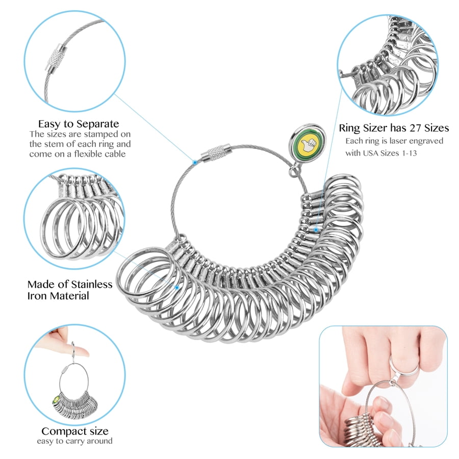 ✔EASY TO USE: Easy to Read Size Chart on Ring Mandrel with Full and 1/2 Sizes, USA Sizing and European, Ring Sizer Gauge 1-13 Including 1/2 Half Size Increments, Plastic Sizer: 1-17 and the Ring Mandrel 1-13. Non-rolling Ring Stick Design. ✔EFFECTIVE: You Don’t Have to Guess Your Ring Size Anymore, You Can Check Your Existing Your Ring Size on the Ring Mandrel or Measure Your Finger with the Plastic Multizer and Double Check the Size with the 27 Pcs Ring Sizer Guage✔BENEFITS: The Gaxcoo Ring Size Measuring Tool Kit Is the #1 in the Market – You’ll Get 1 X Ring Sizer Mandrel; 1 X Ring Sizer Guage; 1 X Multisizer Plastic Measuring Tool; 3 X Polishing Cloth Now You Can Surprise with Gifts and Know They Will Fit.✔QUALITY: Excellent Workmanship and High Quality. Durable and Does Not Rust; Ring Mandrel – Aluminium; 27pcs Ring Sizer – Stainless Steel; Multisizer – Plastic; Cloth – Microfiber Fabric✔100% MONEY BACK GUARANTEED: If for Any Reason You Are Unhappy with the Product We Will Refund You, No Questions Asked!