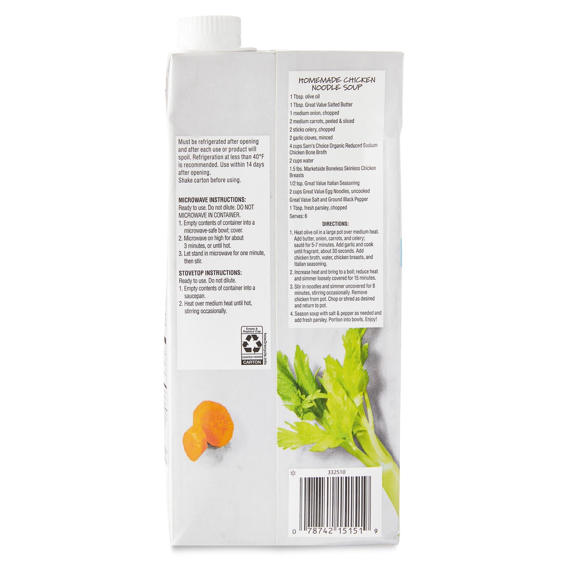 This wonderfully delicious broth is made with slow-simmered organic chicken stock paired with organic onion powder, organic cane sugar, organic carrot juice concentrate, sea salt and organic herbs. Each batch is slow cooked for eight hours to extract and retain all the nutrients and flavors from the high-quality ingredients in the broth to provide you with the best flavor. Enjoy it as a tasty and healthy alternative to tea or coffee in the evenings or use it to add rich flavor and depth to your favorite soups and stews. It can also be used to boil rice, pasta or potato to enhance their flavor. This special pack of chicken broth features 29% less sodium than our regular broth. It’s USDA-Certified Organic, gluten-free, fat-free and has 7g protein per serving, making it a healthy addition to your everyday routine. With Sam’s Choice Organic Chicken Broth, you get all the healthy benefits and taste of homemade chicken broth without the time and effort.