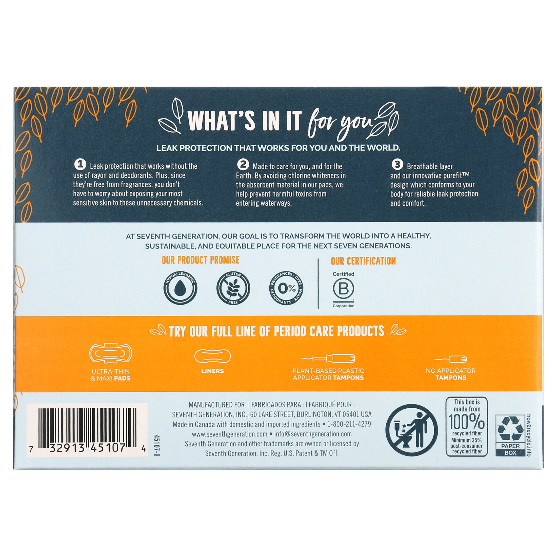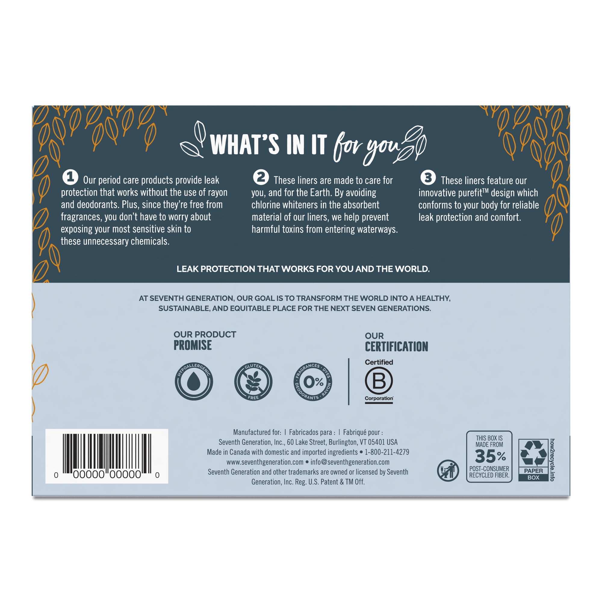 When you get your period, you want free and clear menstrual care that keeps up with your active lifestyle and helps support Menstrual Equity for everyone. Seventh Generation’s Chlorine Free Pads and Liners do both. Our Pantiliner pads’ breathable layer and innovative purefit™ design conforms to your body’s shape for reliable leak protection and comfort—without the use of rayon, dyes, or deodorants. They’re also free from fragrances and hypoallergenic, so your most sensitive skin isn’t exposed to unnecessary chemicals. Our pads are made without chlorine whiteners, helping prevent harmful toxins from entering waterways – so what’s in it for you? Leak protection that works for you and the world. At Seventh Generation, we do business differently. We believe our products are healthy solutions for use within your home–and for the community and environment outside of it. We are always evaluating how to reduce their environmental impact, increase performance and safety, and create a more sustainable supply chain. We believe it is our responsibility to set a course for a more mindful way of doing business, where companies act as partners with other stakeholders to create a brighter future for the whole planet. Seventh Generation is proud to be a Certified B Corporation. B Corps are certified to be better for workers, better for communities, and better for the environment. By choosing Seventh Generation products, you’re joining us in nurturing the health of the next seven generations.