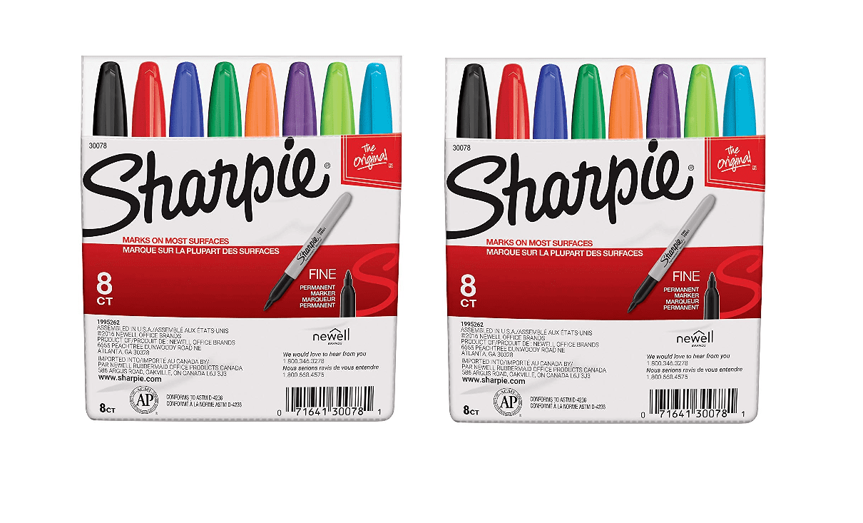 Sharpie 30078 Permanent Markers Fine Point Classic Colors 8 Count2 PACK16 MARKERS TOTALSharpie Fine Point Permanent MarkersDull and boring fades away – but bold and brave lives on. That’s the motto of Sharpie Permanent Markers. Made to write on, stand out on, and stay on practically any surface, it’s the Original Permanent Marker born for unique, unruly, courageous, outrageous self-expression that always leaves a bold mark.Proudly permanent ink marks on paper, plastic, metal and most other surfacesInk dries quickly, is waterproof, smear proof and fade resistant; The AP certified ink is non toxic and long lastingCap with clip makes pen ultra portableContains 8 pens : one each of black, blue, green, red, orange, yellow, purple and brown0.75 inches long by 5.5 inches wide by 0.625 inches high; 0.02 pounds; Made in the USASharpie 30078 Permanent Markers Fine Point Classic Colors 8 Count 2 PACK