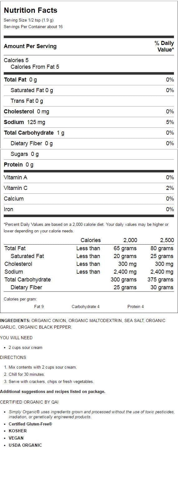 Product overview Rich, creamy and bursting with the flavor fusion of onion, garlic and a hint of black pepper, our French Onion Soup Mix makes entertaining easy. Country of origin : USA Organic : Yes Vegan : Yes Kosher : Yes Size : 1.1 OZSimply Organic Organic French Onion Dip 1.1 oz.