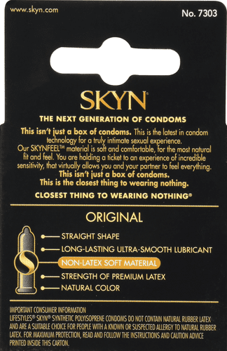 - SKYN Original Non-Latex Lubricated condoms provide a natural feeling with heightened sensitivity, while being safe and suitable for people with latex allergy and latex sensitivity
