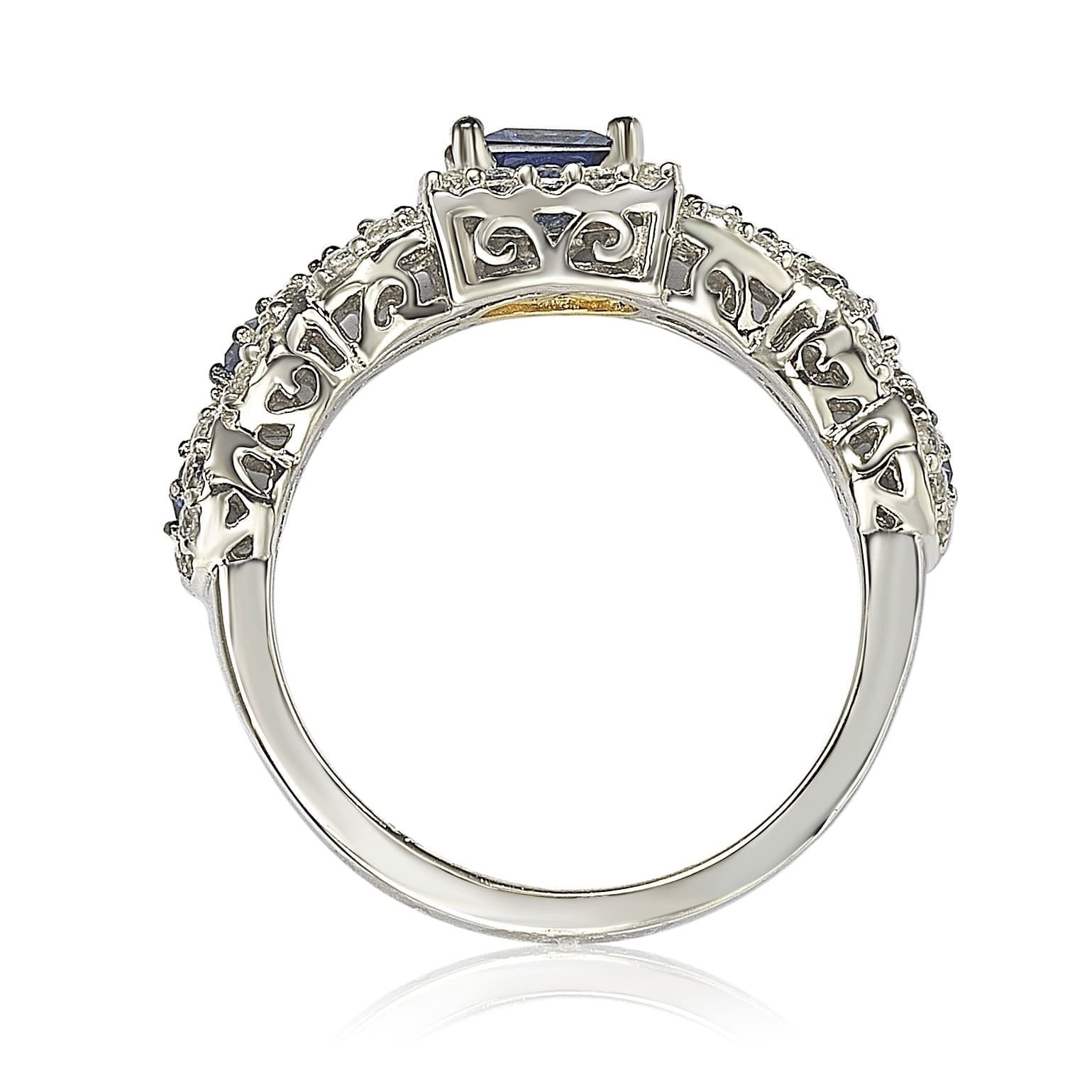 Embrace a modern twist on an all-time classic bridal style. A rich blue assher cut natural sapphire gemstone is prong-set in the center with smaller diamond-cut blue sapphires set along the band, surrounded by a crossover halo of created white sapphires. These gems are all individually hand set in sterling silver, with a unique designer two-tone SL Collection gallery to create a beautiful ring inside and out. This ring is designed by SL Collection with a message. By creating jewelry that is beautiful inside and out, SL Collection’s message is revealed through a hidden brown diamond (.02 ct) set in the shank of this ring to empower women to discover their inner strength, power and beauty. This ring has a closed under-gallery for comfort fit with a unique yellow plated SL Collection’s SL logo. ‘Together we can inspire the world to appreciate the diamond in ourselves.’ – S.L.SL Collection Sterling Silver Assher Cut Sapphire and Diamond Accent Bridal Engagement Ring – Blue