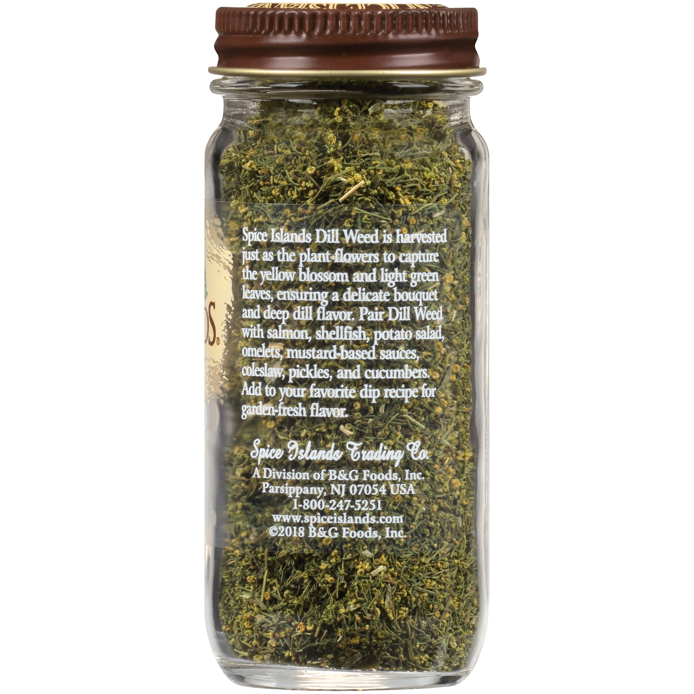 Spice Islands Dill Weed is harvested just as the plant flowers to capture the yellow blossom and light green leaves, ensuring a delicate bouquet and deep dill flavor. Pair Dill Weed with salmon, shellfish, potato salad, omelets, mustard-based sauces, coleslaw, pickles, and cucumbers. Add to your favorite dip recipe for garden-fresh flavor.