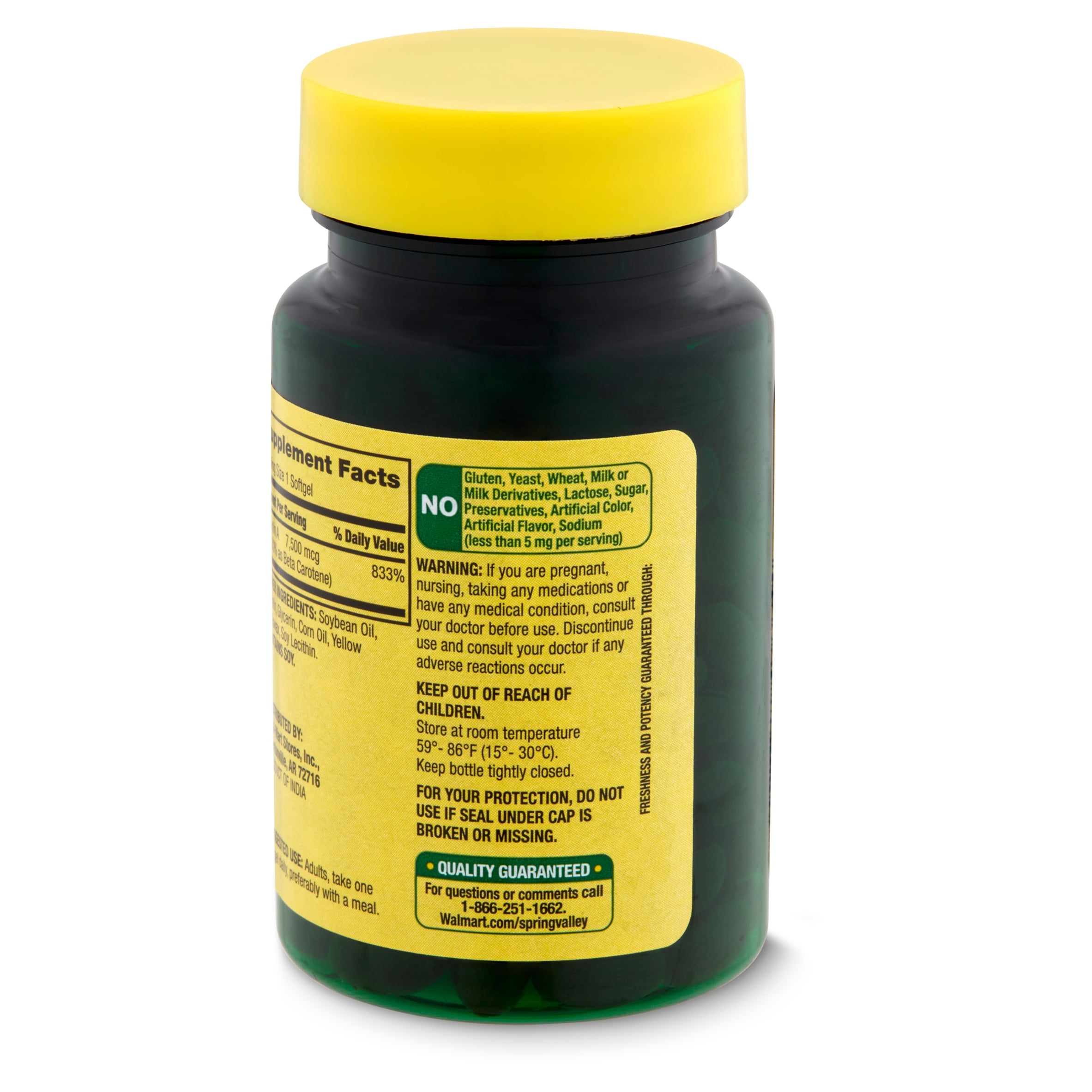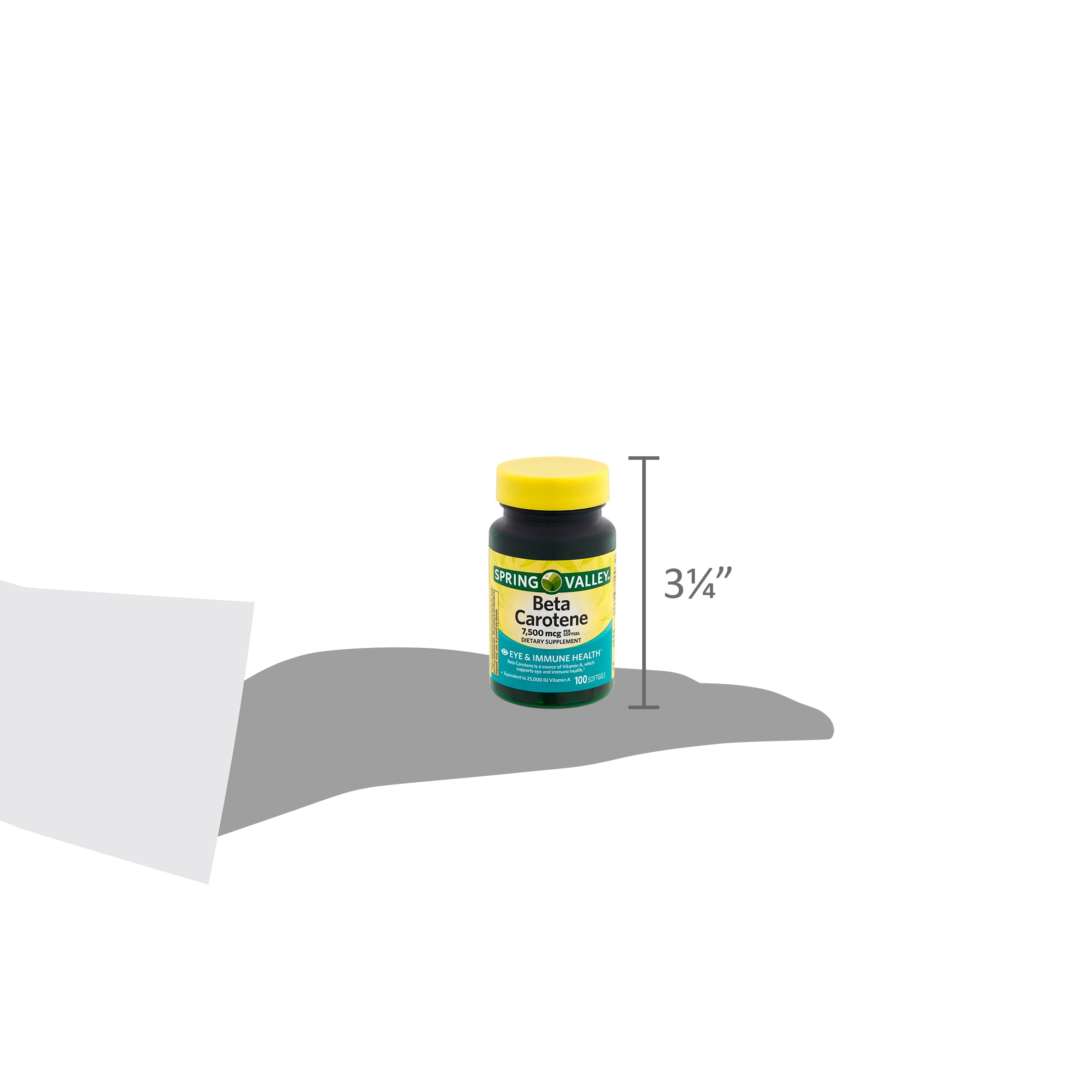 Spring Valley Beta Carotene Dietary Supplement, 7,500 mcg, is a supplement designed to support eye and immune health. Each softgel contains 7,500 micrograms of beta carotene, an antioxidant that naturally occurs in the body and converts to vitamin A. This supplement contains no gluten, yeast, wheat, milk or milk derivatives, lactose, sugar, preservatives, artificial color, or artificial flavor, and less than 5 milligrams of sodium per serving. The suggested adult dosage is one softgel daily, preferably with a meal. You can rest assured that Spring Valley Beta Carotene Dietary Supplement, 7,500 mcg, is produced with strict quality guidelines and is backed by our quality guarantee.