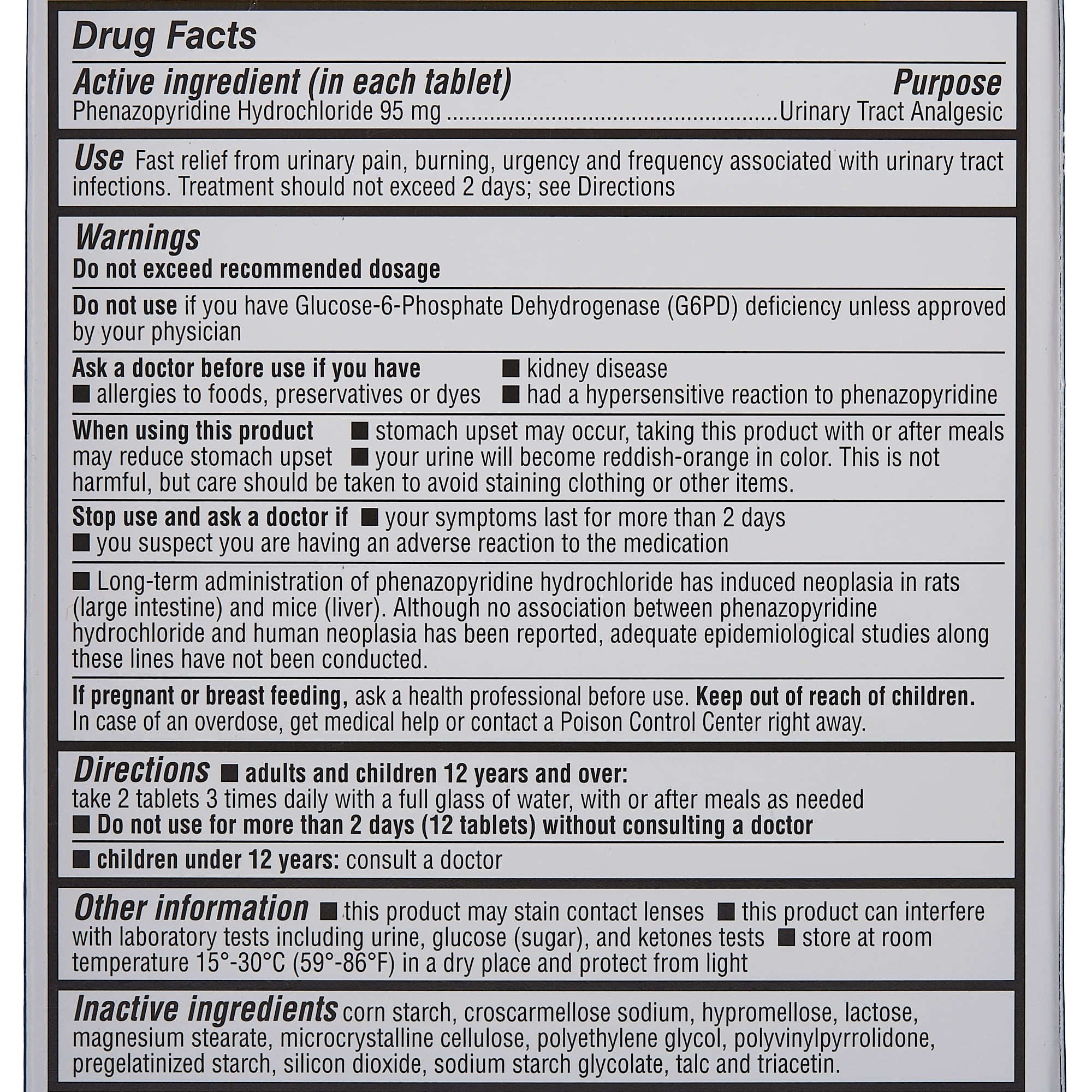 Fast relief from urinary pain, burning, urgency, and frequency associated with urinary tract infections.Directions: Adults and children 12 years and over: Take 2 tablets 3 times daily with a full glass of water, with or after meals as needed. Children under 12 years: Consult a doctor. Do not use for more than 2 days (12 tablets) without consulting a doctor. This product may stain contact lenses. This product can interfere with laboratory tests including urine, glucose (sugar) and ketones tests. Long term administration of phenazopyridine HCl has induced neoplasia in rats (large intestine) and mice (liver). Although no association between phenazopyridine hydrochloride and human neoplasia has been reported, adequate epidemiological studies along these lines have not been conducted. Store at room temperature 15-30 degrees C (59-86 degrees F) in a dry place and protect from light.Active Ingredients: In Each Tablet: Phenazopyridine Hydrochloride 95 mgInactive Ingredients: Lactose; Magnesium Silicate; Magnesium Stearate; Microcrystalline Cellulose; Pharmaceutical Glaze; Sodium Starch Glycolate; May Also Contain: Corn Starch; Croscarmellose Sodium; Polyvinylpyrrolidone; Pregelatinized Starch; Silicon Dioxide