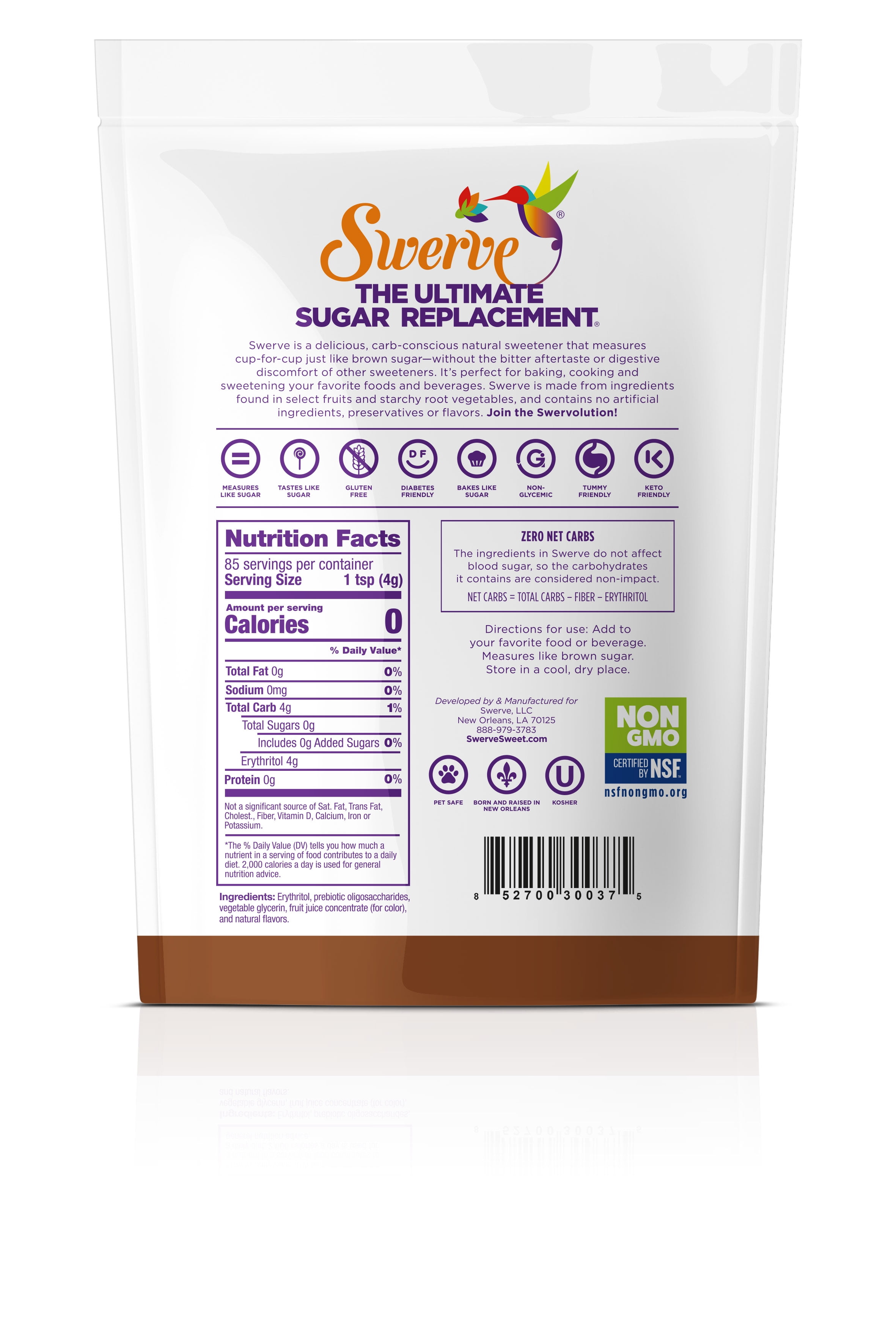 Swerve is a delicious, carb-conscious natural sweetener that measures cup-for-cup just like sugar—without the bitter aftertaste or digestive discomfort of other sweeteners. It’s perfect for baking, cooking and sweetening your favorite foods and beverages. Swerve is made from ingredients found in select fruits and starchy root vegetables, and contains no artificial ingredients, preservatives or flavors. Join the Swervolution!