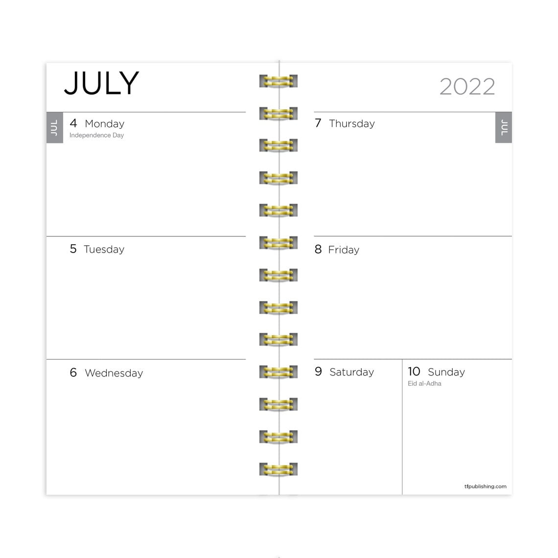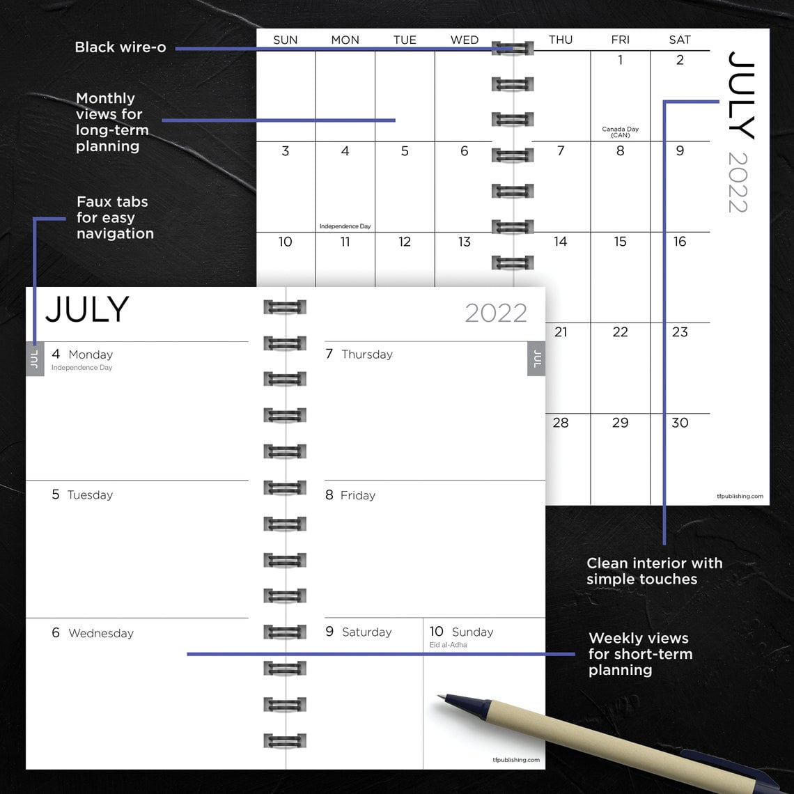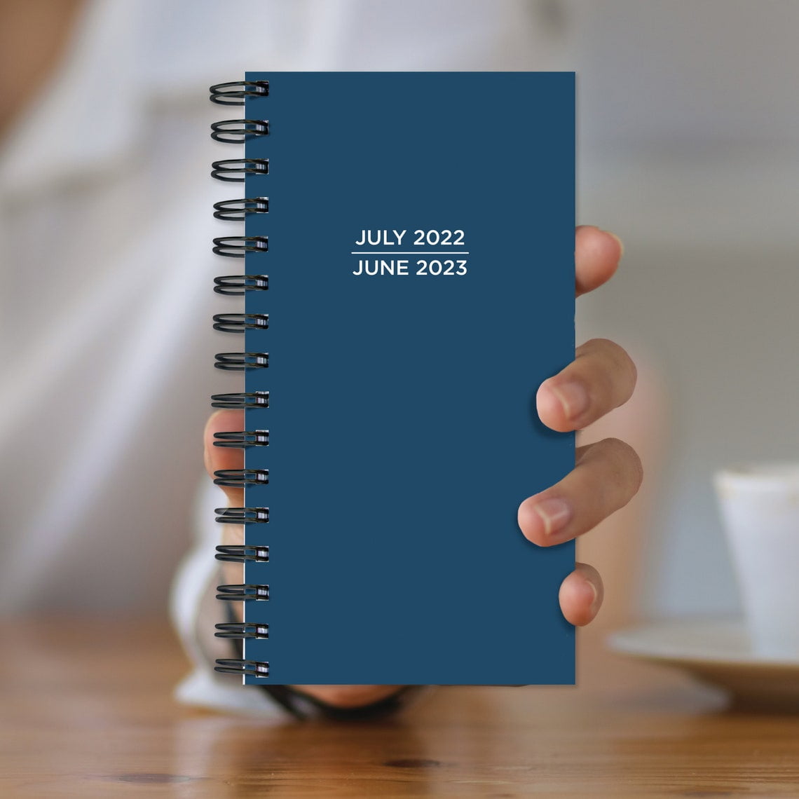 Keep your mind clear and your schedule organized with this straightforward 12 month academic year, weekly/monthly planner in blue! Compact but rugged enough to fit in a pocket, handbag or backpack. Weekly planning pages offer open spaces for detailed, daily plans and faux tabs for quick reference. The durable and textured cover has black wire-o binding to lay flat when open with a bonus glance at page for years 2022 and 2023 in the front and notes pages in the back.