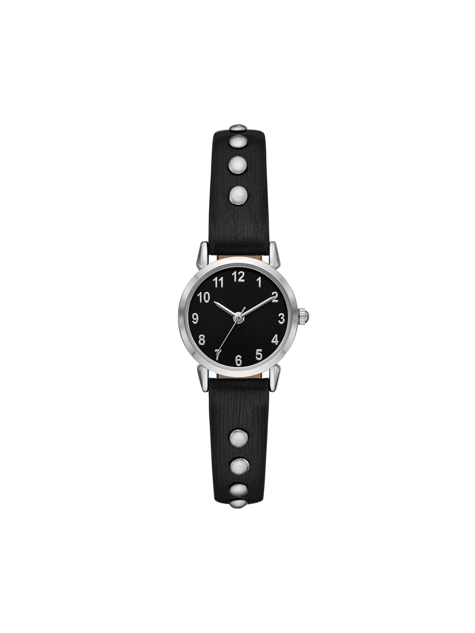 Time and Tru Ladies’ Watch with Silver Tone Case, Black Easy Read Dial and Black Vegan Leather Strap with Silver Tone Stud Accents