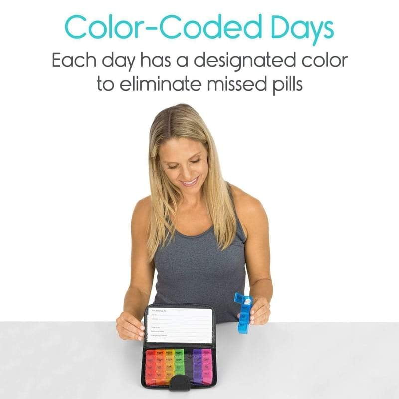 - COLOR-CODED CONTAINERS: Easily for an entire week with seven individual pill containers. Color-coded for quick identification, each daily case includes a transparent, easy-to-open lid to eliminate accidental spills