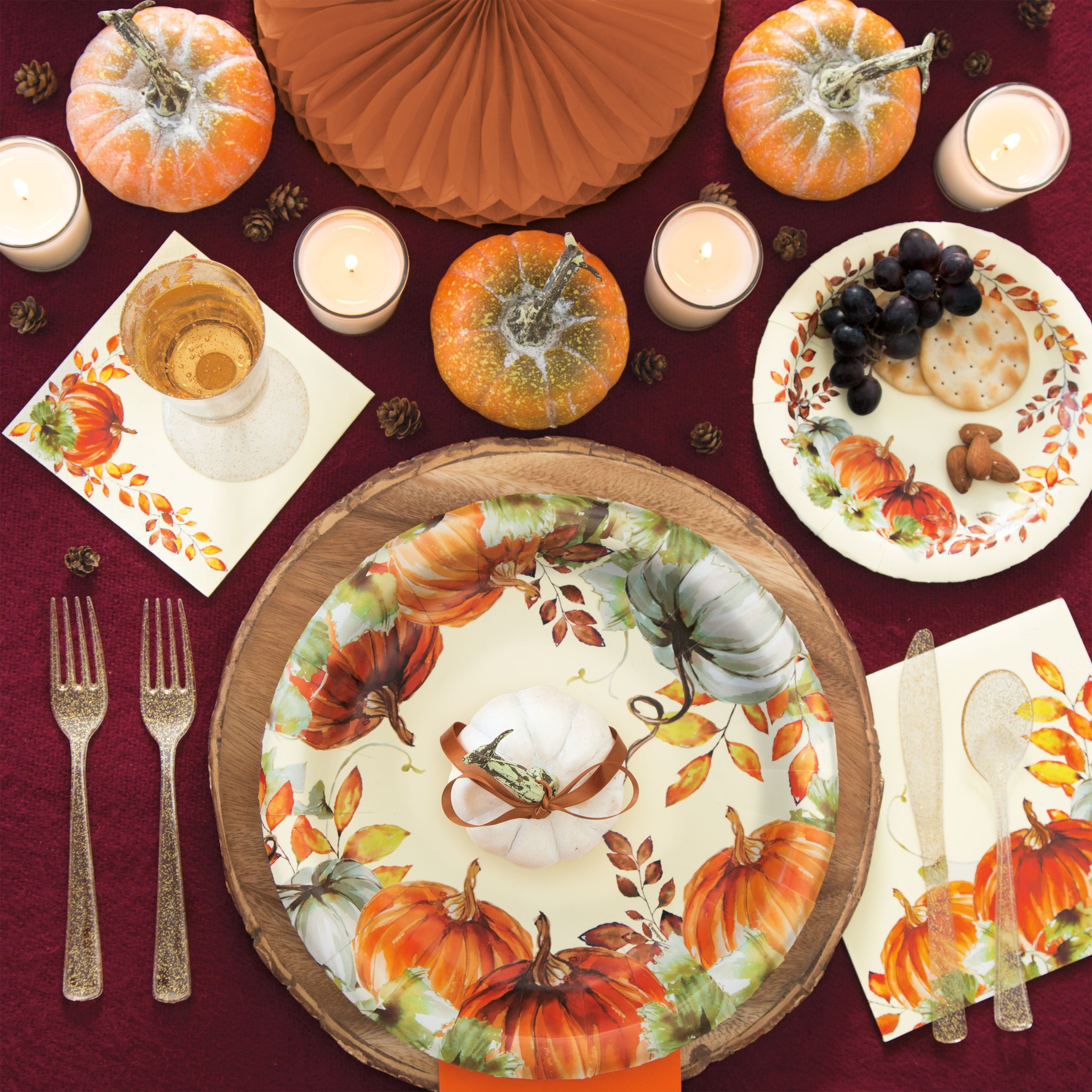 Center big slices of pie on top of our Watercolor Pumpkins Fall Paper Plates. These 7-inch paper cake plates are the ideal size for serving pumpkin pie with scoops of ice cream and other classic Thanksgiving desserts. Each set comes with 8 disposable plates made of extra-strong paper that you can use to set the table for your Thanksgiving dinner. Add a little (pumpkin) spice to your celebration – shop the rest of our affordable Thanksgiving party supplies!