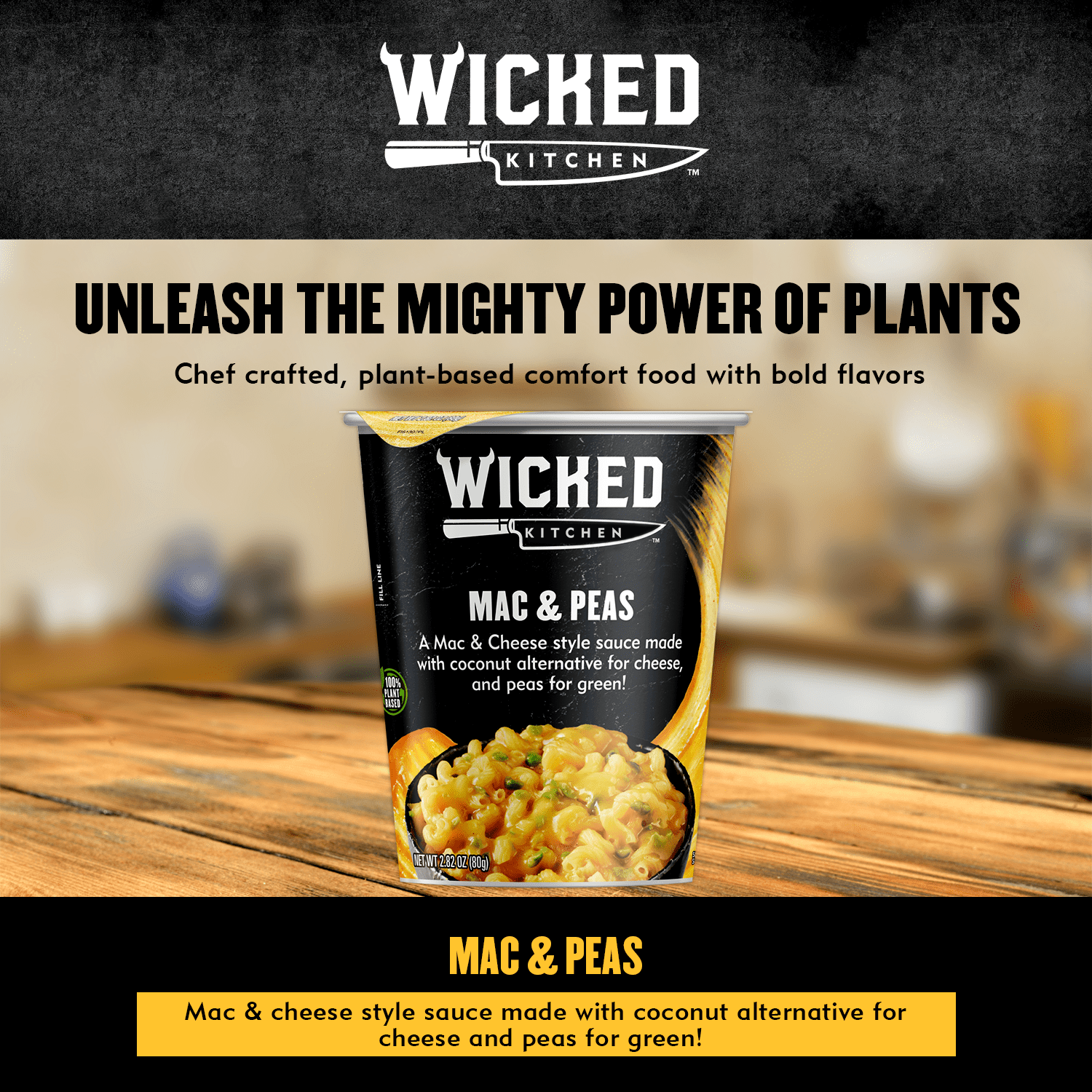 Wicked Foods Mac and Peas Savory Meal Cup. Quick to make Mac & Cheese Style sauce make with coconut alternative for cheese, and peas for green! Great tasting, convenient option for lunch, dinner, or snack. Single Serve. 2.82 Ounces.