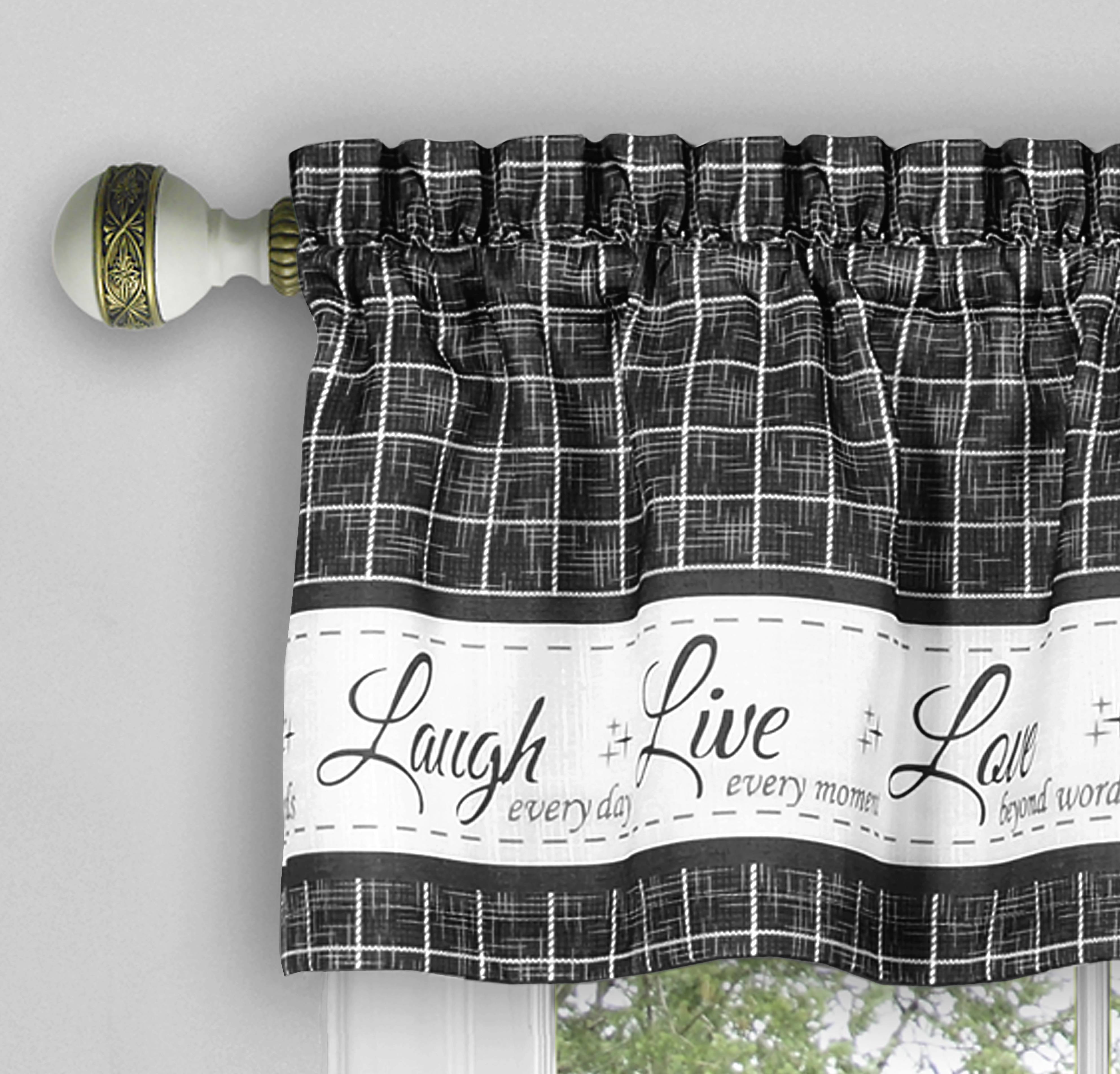 Set of 3 Kitchen Curtains and Valances Set, Love Family Laugh Live, Black Buffalo Plaid