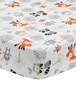 Bedtime Originals Woodland Friends Fox/Owl/Raccoon 100% Polyester Fitted Sheet, Crib Bed – White, Gray and Brown