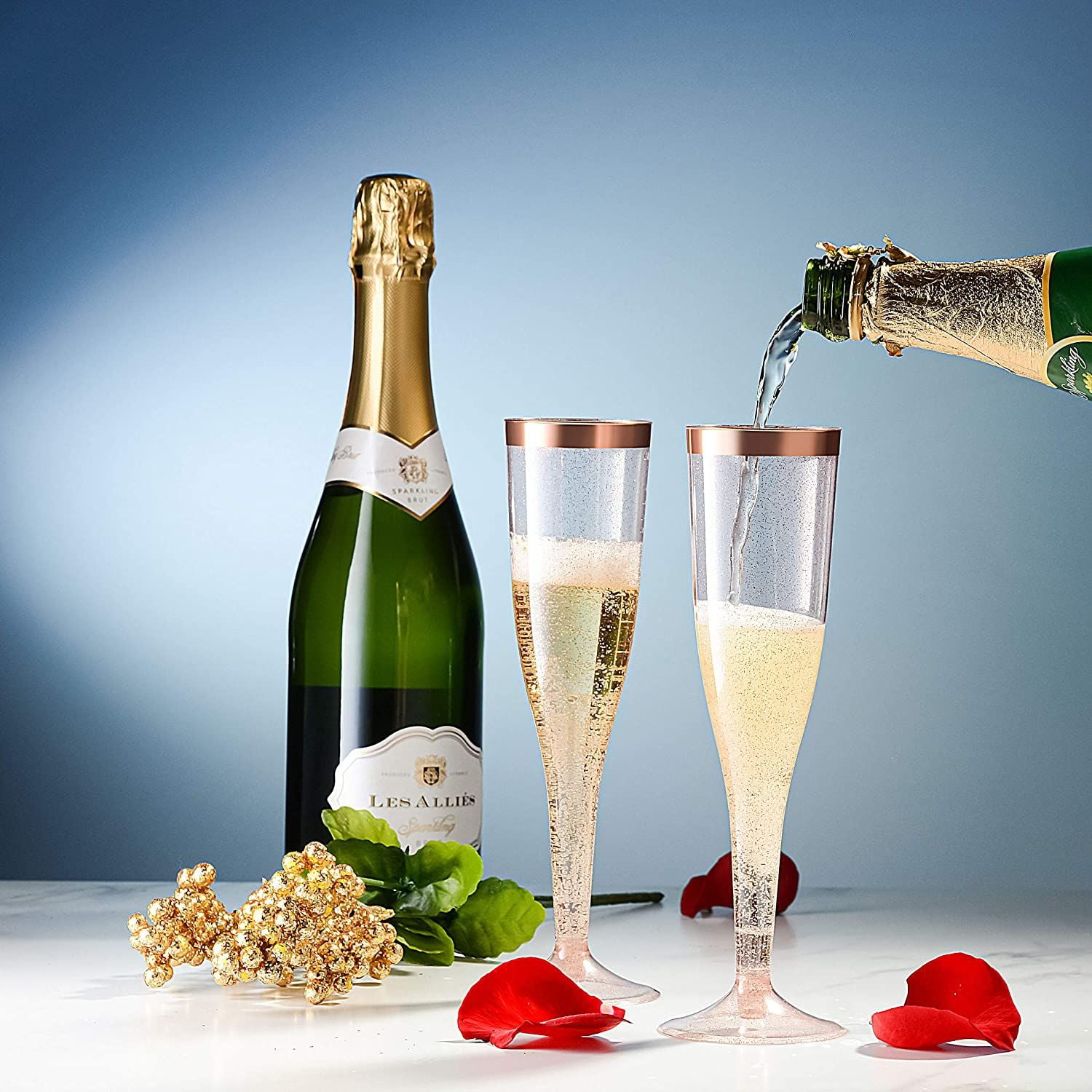 Rose Gold Plastic Champagne Flutes Disposable – Rose Gold Glitter with a Rose Gold Rim – [1 Box of 36 ] 6.5 Oz – Elegant Stylish Mimosa Glasses Perfect for Weddings Bachelorette Party, Catered Events