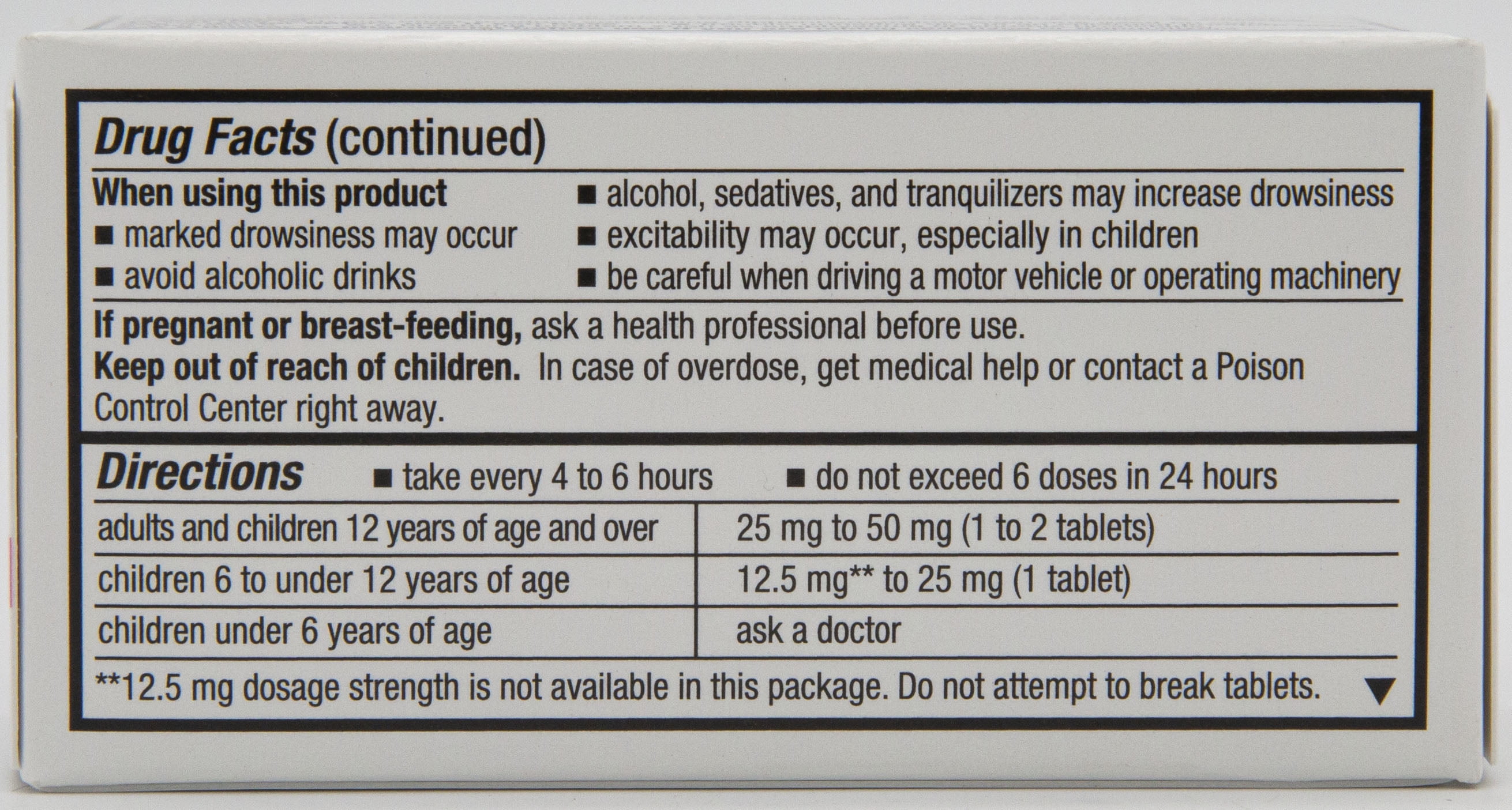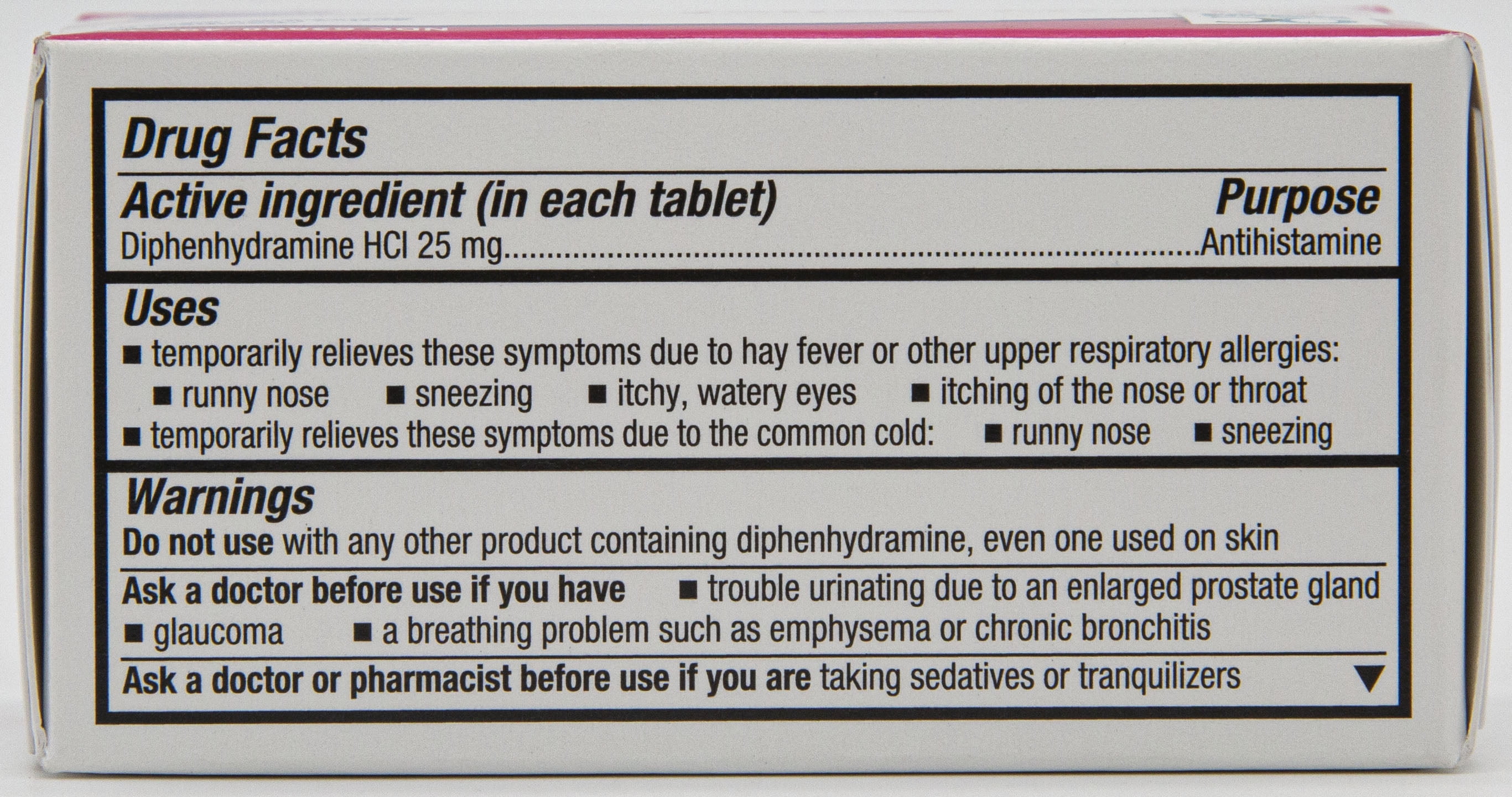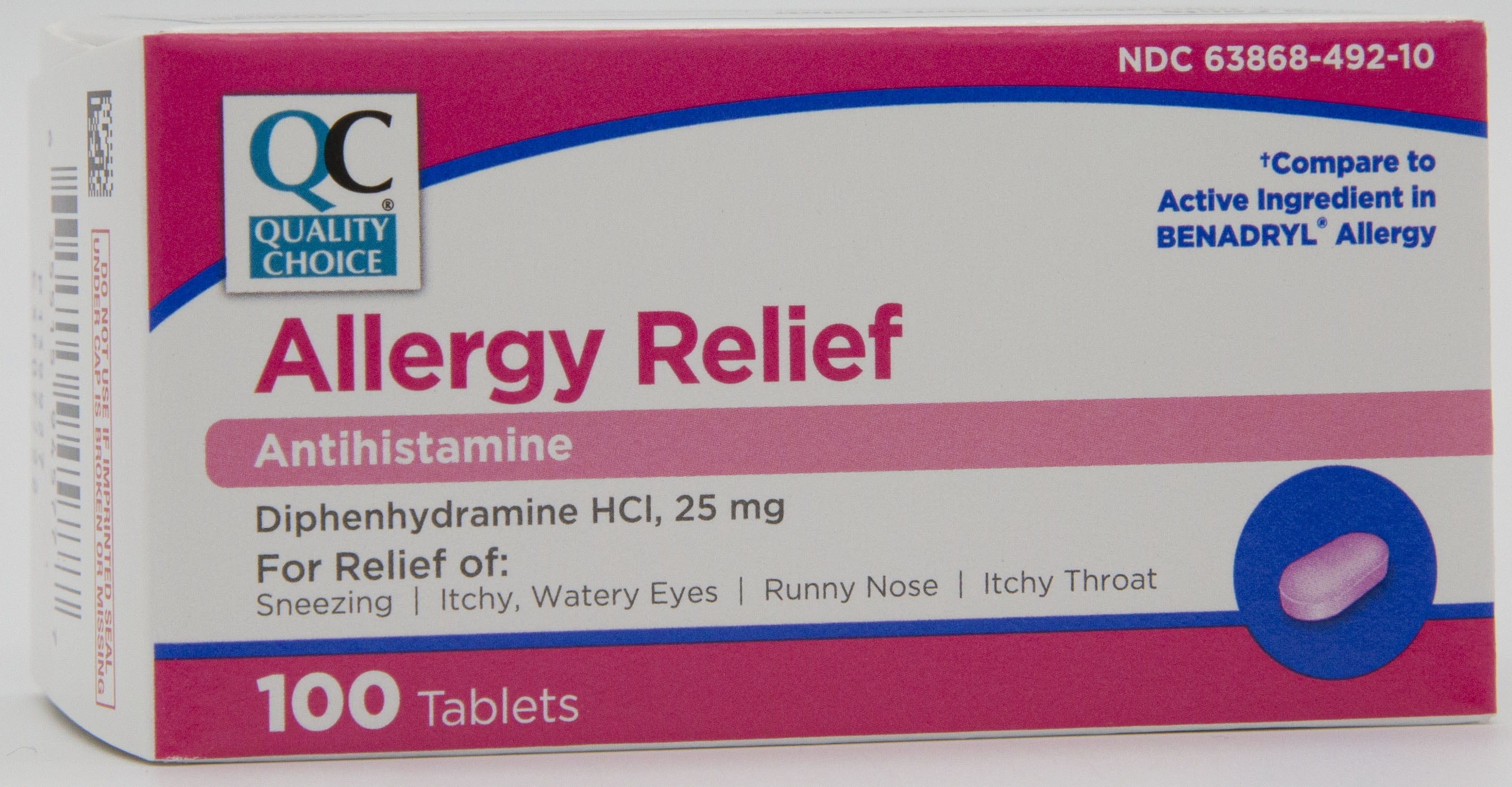 For Allergy Relief •sneezing •runny nose •itchy throat •itchy, watery eyes 100 Ultratab® Tablets – Small Tablet size. •Easy to Swallow. Child-Resistant Packaging. Indications Temporarily relieves these symptoms due to hay fever or other upper respiratory allergies: •runny nose •sneezing •itchy, watery eyes •itching of the nose or throat Temporarily relieves these symptoms due to the common cold: •runny nose •sneezing Warnings Do not usewith any other product containing diphenhydramine, including one applied topically.Ask a doctor before use if you have: •glaucoma •trouble urinating due to an enlarged prostate gland •a breathing problem such as emphysema or chronic bronchitis As a doctor or pharmacist before use if you are taking sedatives or tranquilizers. When using this product: •marked drowsiness may occur. •avoid alcoholic drinks. •alcohol, sedatives, and tranquilizers may increase drowsiness. •be careful when driving a motor vehicle or operating machinery. •excitability may occur, especially in children. If pregnant or breast-feeding, ask a health professional before use. Keep out of reach of children. In case of overdose, get medical help or contact a Poison Control Center right away. Each tablet safety sealed. Do not use if blister or foil is broken. Active Ingredients: in each tablet: Diphenhydramine HCl (25 mg – Antihistamine) Inactive Ingredients: Candelilla Wax, Crospovidone, Dibasic Calcium Phosphate Dihydrate, D&C Red 27 Aluminum Lake, Hydroxypropyl Methylcellulose, Magnesium Stearate, Microcrystalline Cellulose, Polyethylene Glycol, Polysorbate 80, Pregelatinized Starch, Stearic Acid, Titanium DioxideDo not take more than 6 doses in 24 hours. Adults and children 12 years of age and over 25mg to 50mg (1 to 2 tablets) Children 6 to under 12 years of age 12.5mg** to 25mg (1tablet) Children under 6 years of age ask a doctor2 Pack Quality Choice Allergy Complete 100 Tablets Each