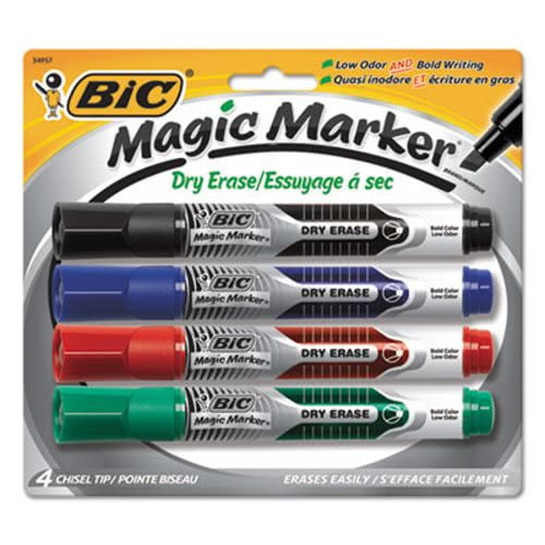 Magic Marker Brand Low Odor & Bold Writing Dry Erase Markers Low odor and bold writing with one marker. Erases easily and provides smooth, consistent ink flow. Features a see-through label that indicates when ink is low. For use on Dry Erase Boards and other nonporous surfaces.Marker Type: Dry Erase; Assortment: Black; Blue; Green; Red; Color(s): Assorted; Tip Type: Chisel.Bic Magic Marker Brand Low Odor & Bold Writing Dry Erase Markers, Assorted, 4/Pk