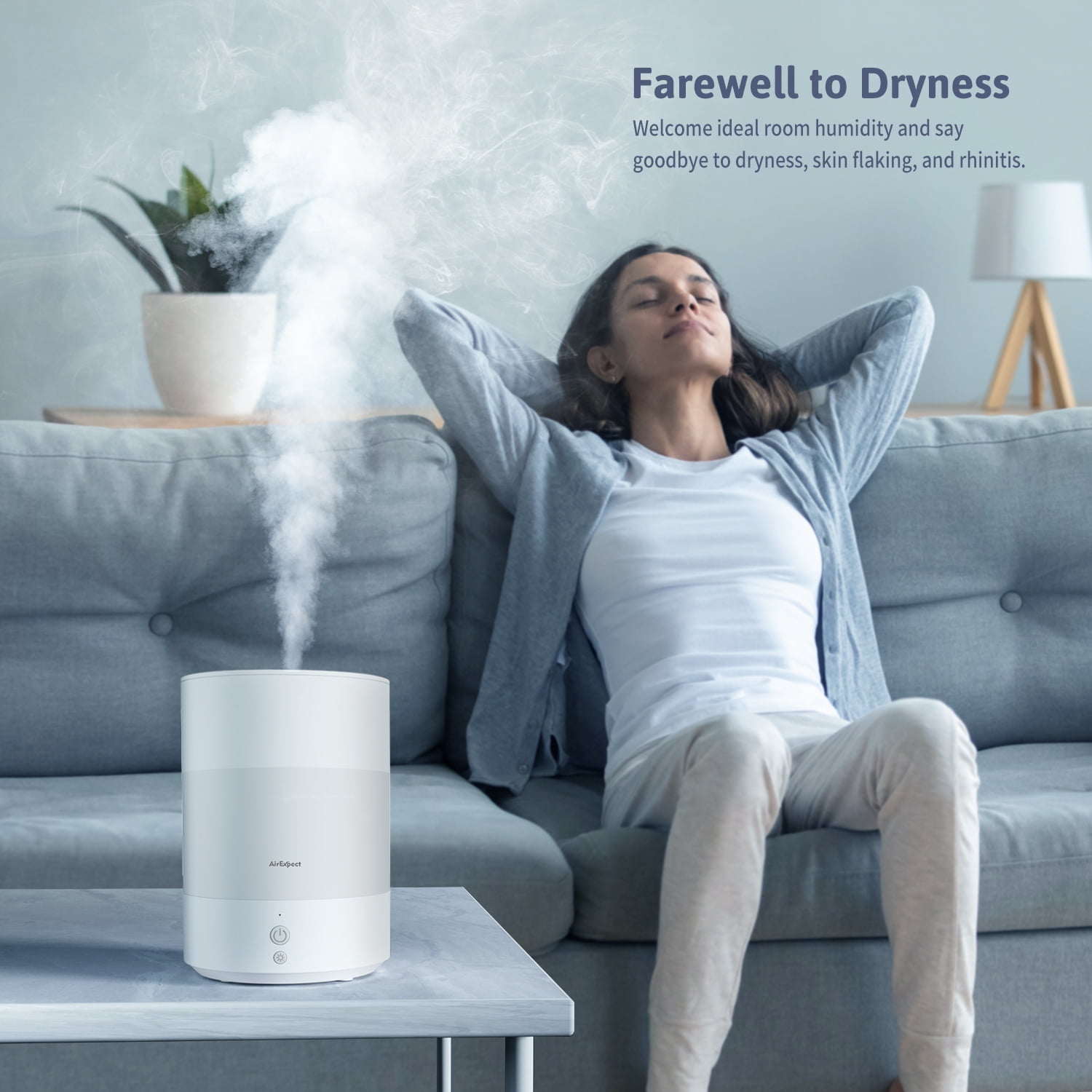AirExpect ultrasonic humidifier delivers a cool mist to humidify your room. This 2.5L capacity humidifier for bedroom has 2 mist levels, supporting either 15 hours high mist mode (150ml/h) or 30 hours low mist mode (80ml/h). After turning it on, you can enjoy the optimal room humidity with soft yellow ambient light.