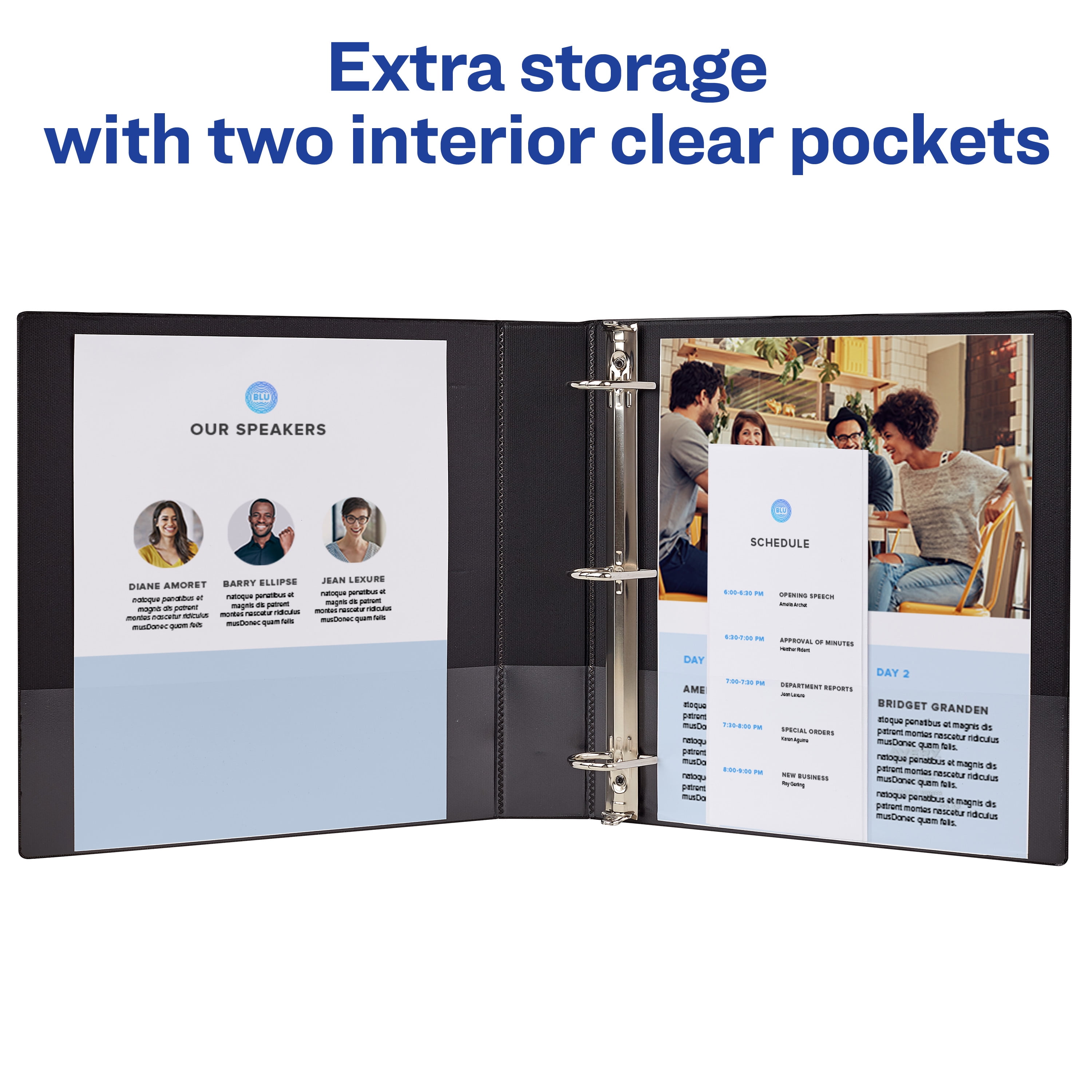 Designed with toughness and durability in mind, the Avery Durable View 1.5 inch binder stands strong where many basic binders fall apart. Its sturdy exterior features a tear-resistant spine (DuraHinge) and more flexible, split-resistant edges (DuraEdge). Durable binders are also fully adhered with a deep-weave polypropylene cover that is resistant to bubbling, surface wrinkles, and is tear-resistant. The interior of this classic black binder is just as impressive as its exterior. With back-mounted slant rings, your pages will never curl again. Pages lay flat and are easy to turn, while the cover opens and closes without pulling on your papers. Enjoy extra organization and storage capabilities with two interior clear pockets made of nonstick material that won’t lift or transfer ink from your documents. Durable binders are perfect for activities that require frequent referencing. Works great as a school binder, recipe binder, music binder, photo album, scrapbook and more. Each binder holds up to 375 sheets of paper with 1.5 inch capacity slant rings.