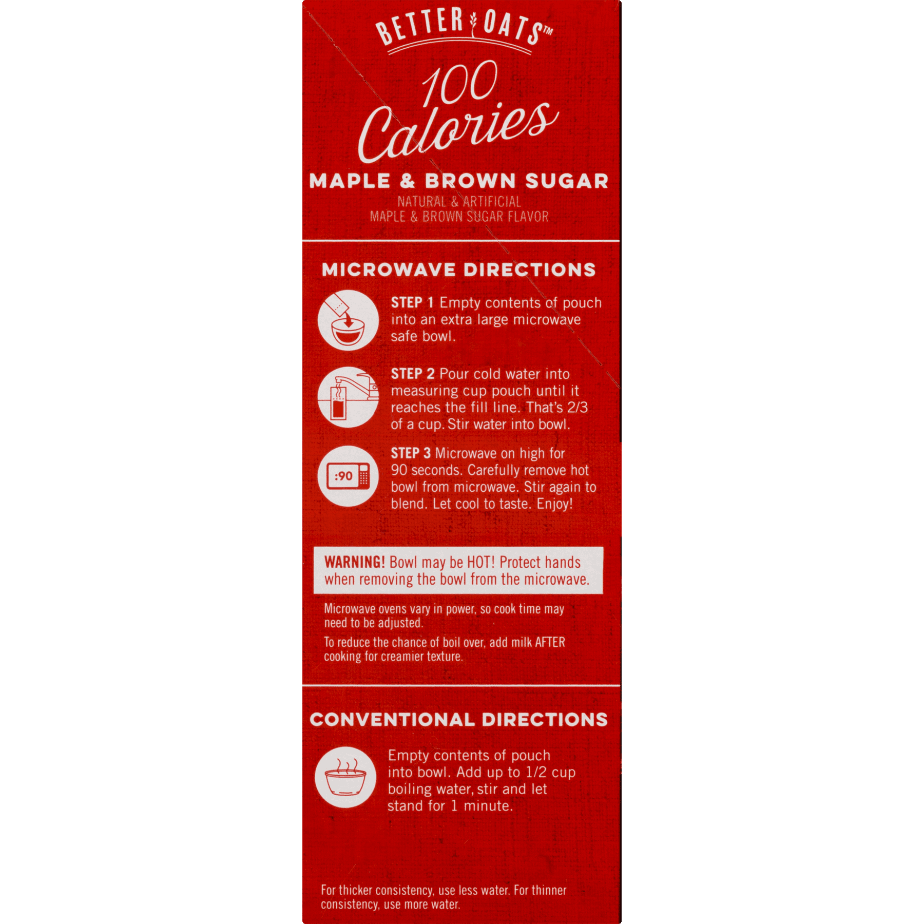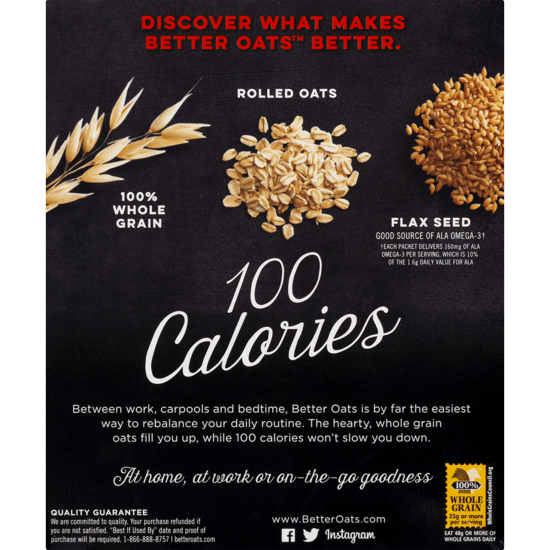 - Instant oatmeal with flax seeds. 10 measuring cup pouches. Natural & artificial maple & brown sugar flavor. Ready in 90 seconds. Per Pouch: 100 calories; 0 g sat fat (0% DV); 210 mg sodium (9% DV); 1 g sugars. Discover what makes Better Oats better. Rolled oats. Made with whole grain. Flax Seed: Good source of ALA omega-3 (Each packet delivers 160 mg of ALA omega-3 per serving, which is 10% of the 1.6 g daily value for ALA). Between work, carpools and bedtime, Better Oats is by far the easiest way to rebalance your daily routine. The hearty, whole grain oats fill you up, while 100 calories won’t slow you down. At home, at work or on-the-go goodness. Quality Guarantee: We are committed to quality. Your purchase will be refunded if you are not satisfied. Best if used by date and package UPC will be required. betteroats.com. www.BetterOats.com. Facebook. Twitter. Instagram. 100% Whole Grain: 25 g or more per serving. 100% of the grain is whole grain. WholeGrainsCouncil.org. Partially produced with genetic engineering.