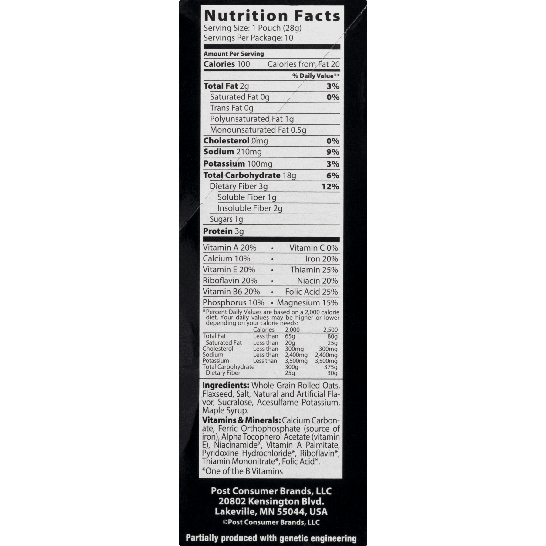 Oatmeal, Instant, with Flax, Maple & Brown Sugar, 100 Calories, Box 10 CT Instant oatmeal with flax seeds. 10 measuring cup pouches. Natural & artificial maple & brown sugar flavor. Ready in 90 seconds. Per Pouch: 100 calories; 0 g sat fat (0% DV); 210 mg sodium (9% DV); 1 g sugars. Discover what makes Better Oats better. Rolled oats. Made with whole grain. Flax Seed: Good source of ALA omega-3 (Each packet delivers 160 mg of ALA omega-3 per serving, which is 10% of the 1.6 g daily value for ALA). Between work, carpools and bedtime, Better Oats is by far the easiest way to rebalance your daily routine. The hearty, whole grain oats fill you up, while 100 calories won’t slow you down. At home, at work or on-the-go goodness. Quality Guarantee: We are committed to quality. Your purchase will be refunded if you are not satisfied. Best if used by date and package UPC will be required. betteroats.com. www.BetterOats.com. Facebook. Twitter. Instagram. 100% Whole Grain: 25 g or more per serving. 100% of the grain is whole grain. WholeGrainsCouncil.org. Partially produced with genetic engineering. Microwave Directions: Step 1: Empty contents of pouch into an extra large microwave safe bowl. Step 2: Pour cold water into measuring cup pouch until it reaches the fill line. That’s 2/3 of a cup. Stir water into bowl. Step 3: Microwave on high for 90 seconds. Carefully remove hot bowl from microwave. Stir again to blend. Let cool to taste. Enjoy! Warning! Bowl may be hot! Protect hands when removing the bowl from the microwave. Microwave ovens vary in power, so cook time may need to be adjusted. To reduce the change of boil over, add milk after cooking for creamier texture. Conventional Directions: Empty contents of pouch into bowl. Add up to 1/2 cup boiling water, stir and let stand for 1 minute. For thicker consistency, use less water. For thinner consistency, use more water. 10 pouches [9.8 oz (277 g)] 20802 Kensington Blvd. Lakeville, MN 55044 866-888-8757 Post Consumer Brands, LLC