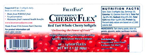 Many of our customers are now taking CherryFlex as a convenient alternative to Tart Cherry Juice Concentrate. – 800mg Per Softgel – 60 Softgels Per Bottle – Supports Healthy Joint Function* – Supports Healthy Cardiovascular Function* – Supports A Healthy Immune System* – Natural Melatonin – Helps Maintain A Normal Sleep Cycle* Ingredients: CherryFlex Paste (Tart Cherries), Olive Oil, Gelatin, Glycerin, Water, Sunflower Lecithin, Beeswax. Scientific Evidence: CherryFlex® supplementation prior to and during eccentric exercise may have a protective effect on oxidative stress (TBARS), inflammation (CRP), range of motion, contractile force loss, and perceived pain. Proprietary Process: We use Grade A American Grown whole fruit as our starting point. In fact, our softgel pills are delicious and can be either chewed or swallowed. Absorption – Perhaps the most important aspect that separates this product from all others is the digestible paste used. Eating (or taking) CherryFlex is completelyMany of our customers are now taking CherryFlex as a convenient alternative to Tart Cherry Juice Concentrate. – 800mg Per Softgel – 60 Softgels Per Bottle – Supports Healthy Joint Function* – Supports Healthy Cardiovascular Function* – Supports A Healthy Immune System* – Natural Melatonin – Helps Maintain A Normal Sleep Cycle* Ingredients: CherryFlex Paste (Tart Cherries), Olive Oil, Gelatin, Glycerin, Water, Sunflower Lecithin, Beeswax. Scientific Evidence: CherryFlex® supplementation prior to and during eccentric exercise may have a protective effect on oxidative stress (TBARS), inflammation (CRP), range of motion, contractile force loss, and perceived pain. Proprietary Process: We use Grade A American Grown whole fruit as our starting point. In fact, our softgel pills are delicious and can be either chewed or swallowed. Absorption – Perhaps the most important aspect that separates this product from all others is the digestible paste used. Eating (or taking) CherryFlex is completely normal for your body. Melatonin – Tart Cherries contain melatonin and CherryFlex is no exception. CherryFlex helps maintain a normal sleep cycle. Convenience. *These statements have not been evaluated by the Food and Drug Administration. This product is not intended to diagnose, treat, cure, or prevent any disease.