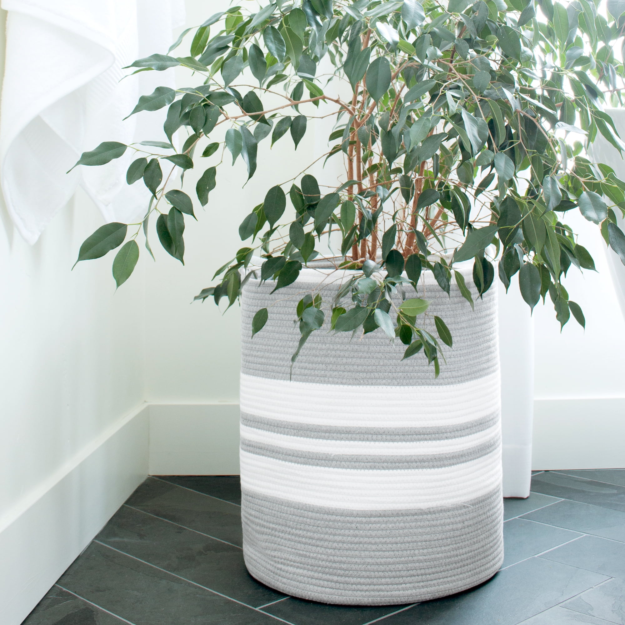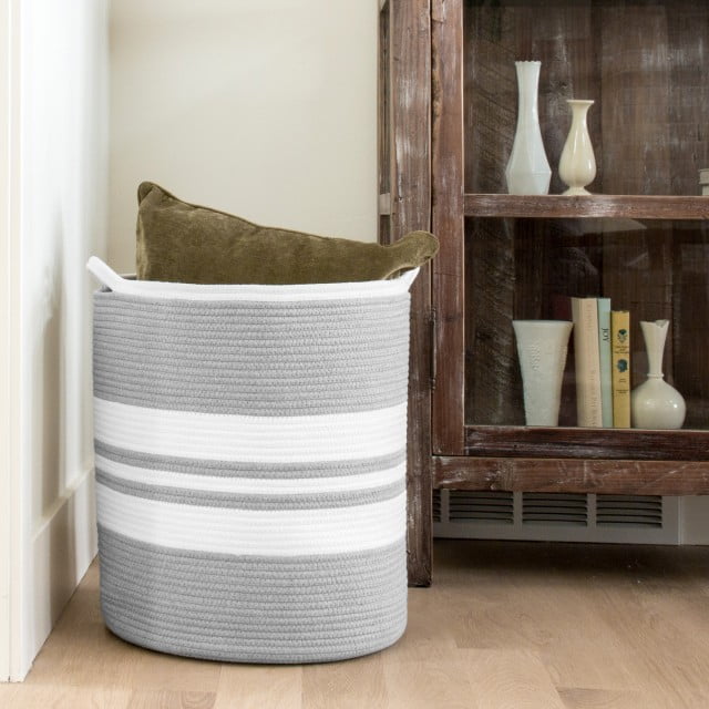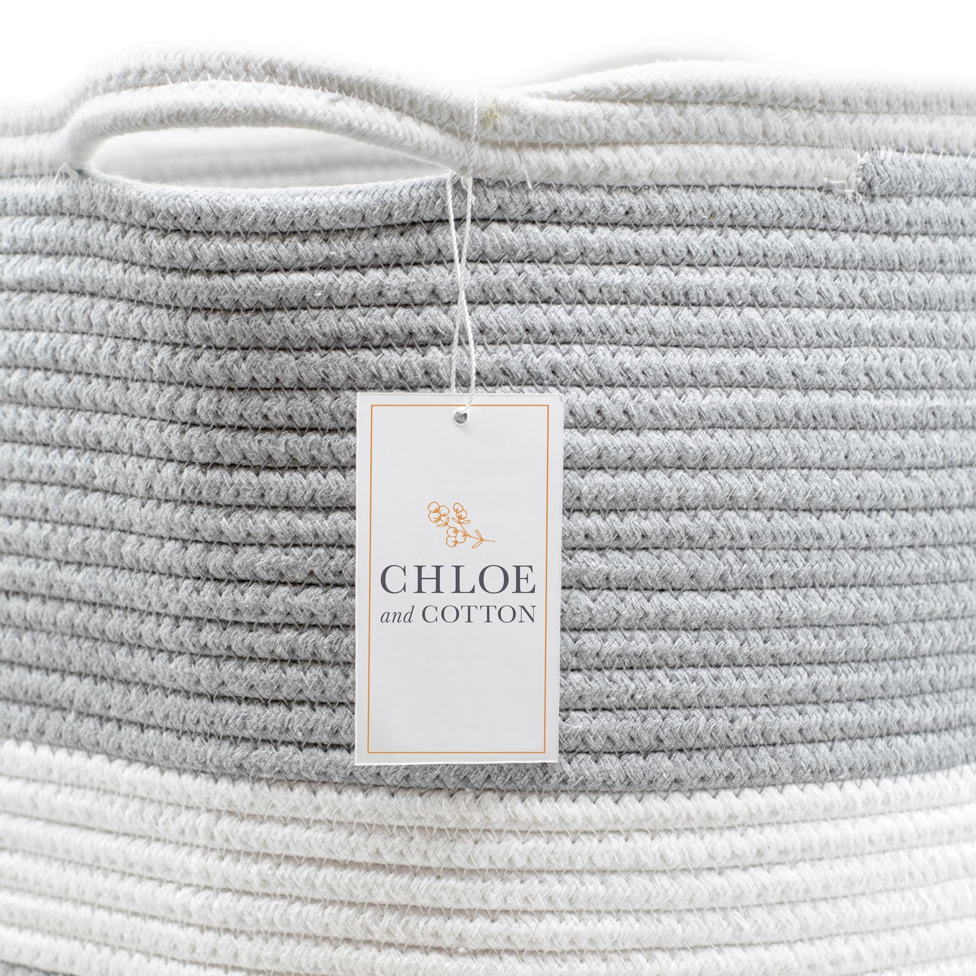 Keep a laundry room or bedroom tidy while also adding a touch of decor with the Chloe and Cotton Woven Rope Laundry Basket. Made in a large size, it works not only as a clothes hamper but also as a place to keep linens, stuffed animal storage, toy storage or extra pillows. Professionally designed in collaboration with Lindsay Hill Interiors, this storage box has a clean, neutral design to add warmth and style to a living space. It complements most styles of decor, ranging from rustic farmhouse to modern minimalist. The large and tall size of the Chloe and Cotton comfy laundry basket organizer creates a large opening for easily putting in and taking out items. An odor-absorbing pack inside helps to eliminate laundry aromas. Woven-in handles make the nursery organizer easier to grab and pick up, even when it has a full load inside. It comes in packaging free of chemical odor so you can place the storage organizer bin in the open without adding smells to the area. Sturdy construction helps the coiled rope basket keep its shape over time and the cotton and polyester material stays smooth without fuzzing or fraying.