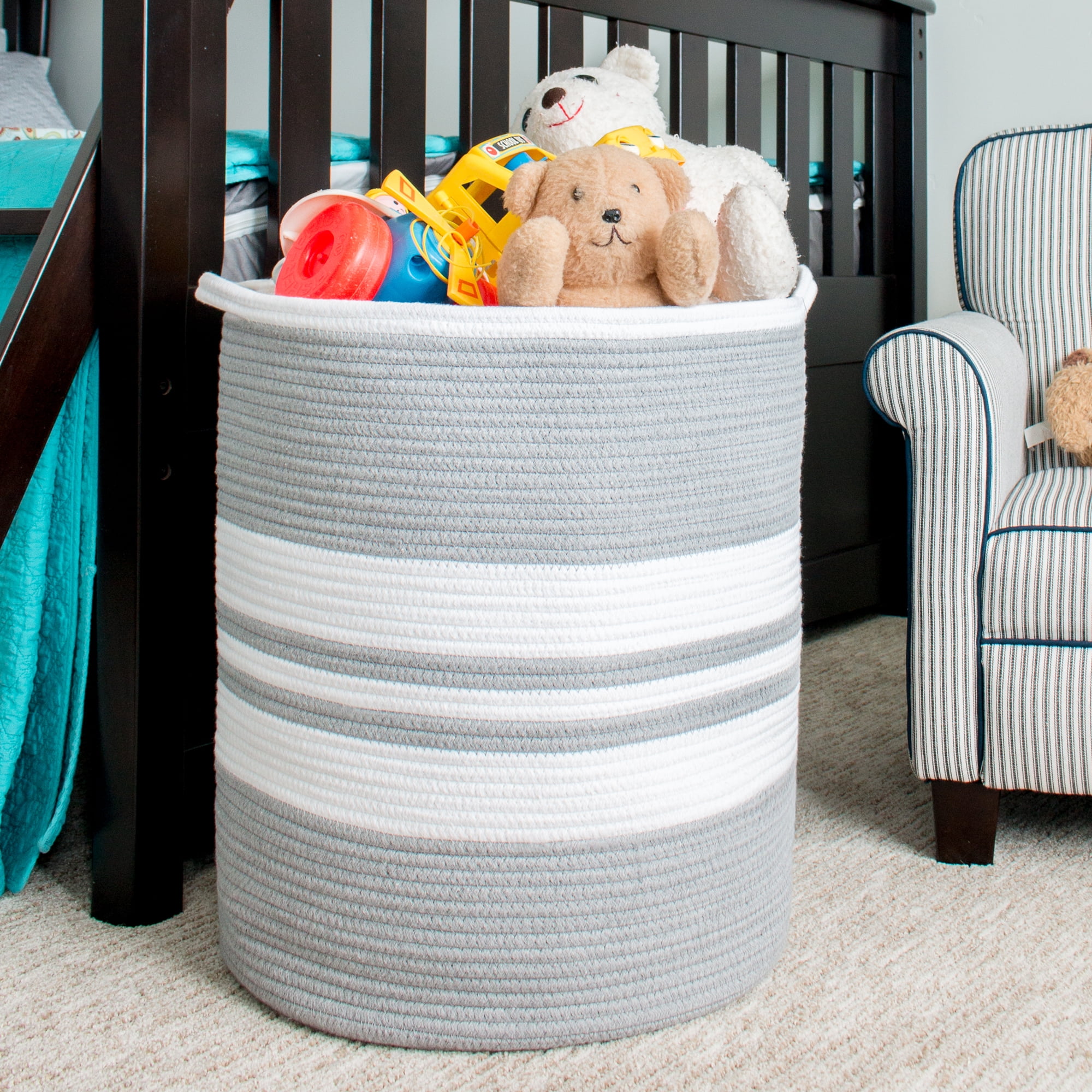 - Our durable and sturdy large baby girl laundry baskets comes in a gender-neutral Gray and White pattern, will maintain its shape over time and with use.