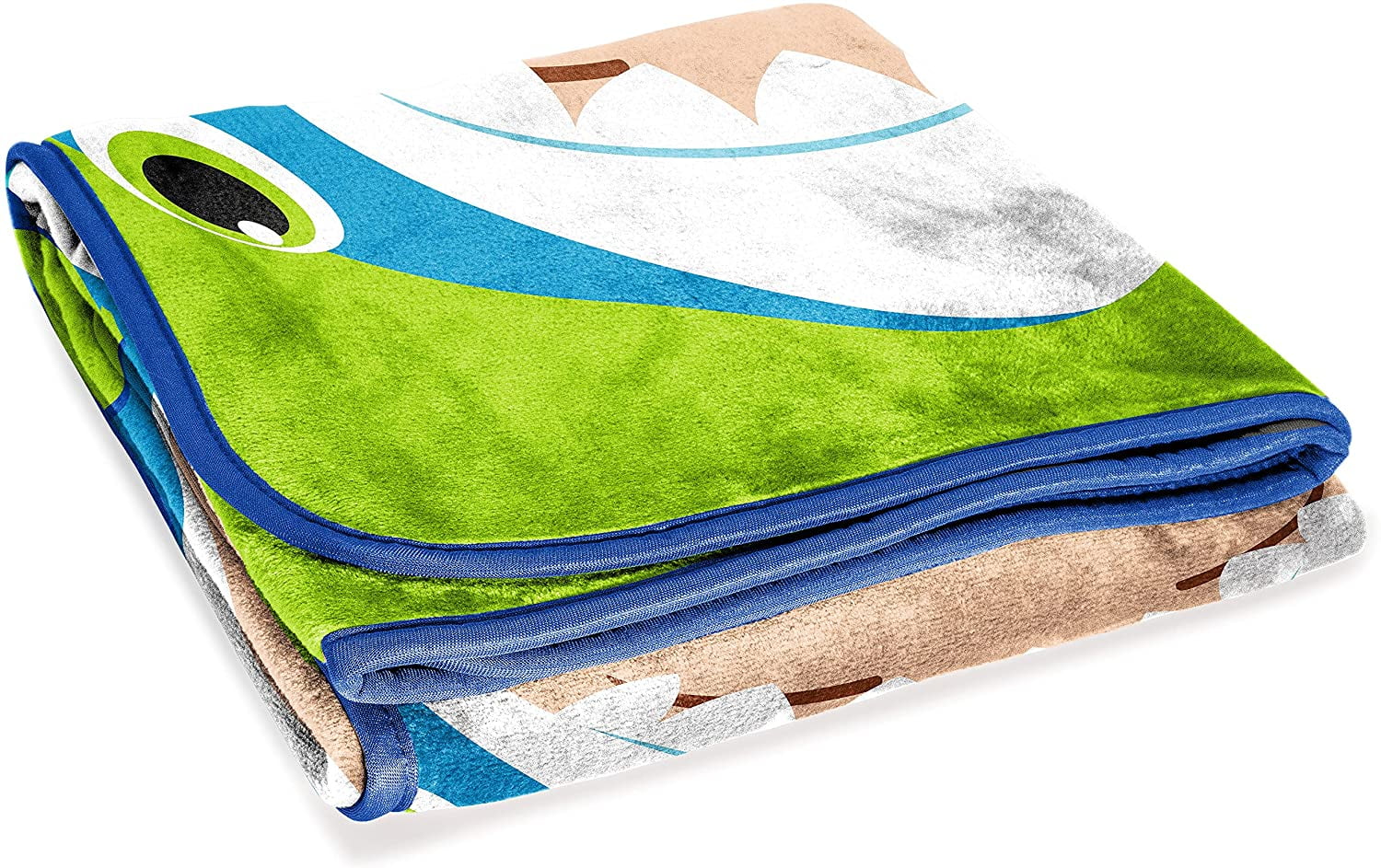 JJ is front and center on this CoComelon JJ Shark Plush Green 46"x60" Throw. Measuring 46 inches by 46 inches, this throw is the perfect size for your child to cuddle under while watching tv, napping, or even traveling. The blue and green throw is printed with CoComelon JJ dressed in his shark swimwear. Made from 100% Microfiber this throw is super soft to the touch. Easy and convenient care instructions include a machine wash cold and tumble dry low. This throw is the perfect gift or travel accessory for any CoComelon loving little one.