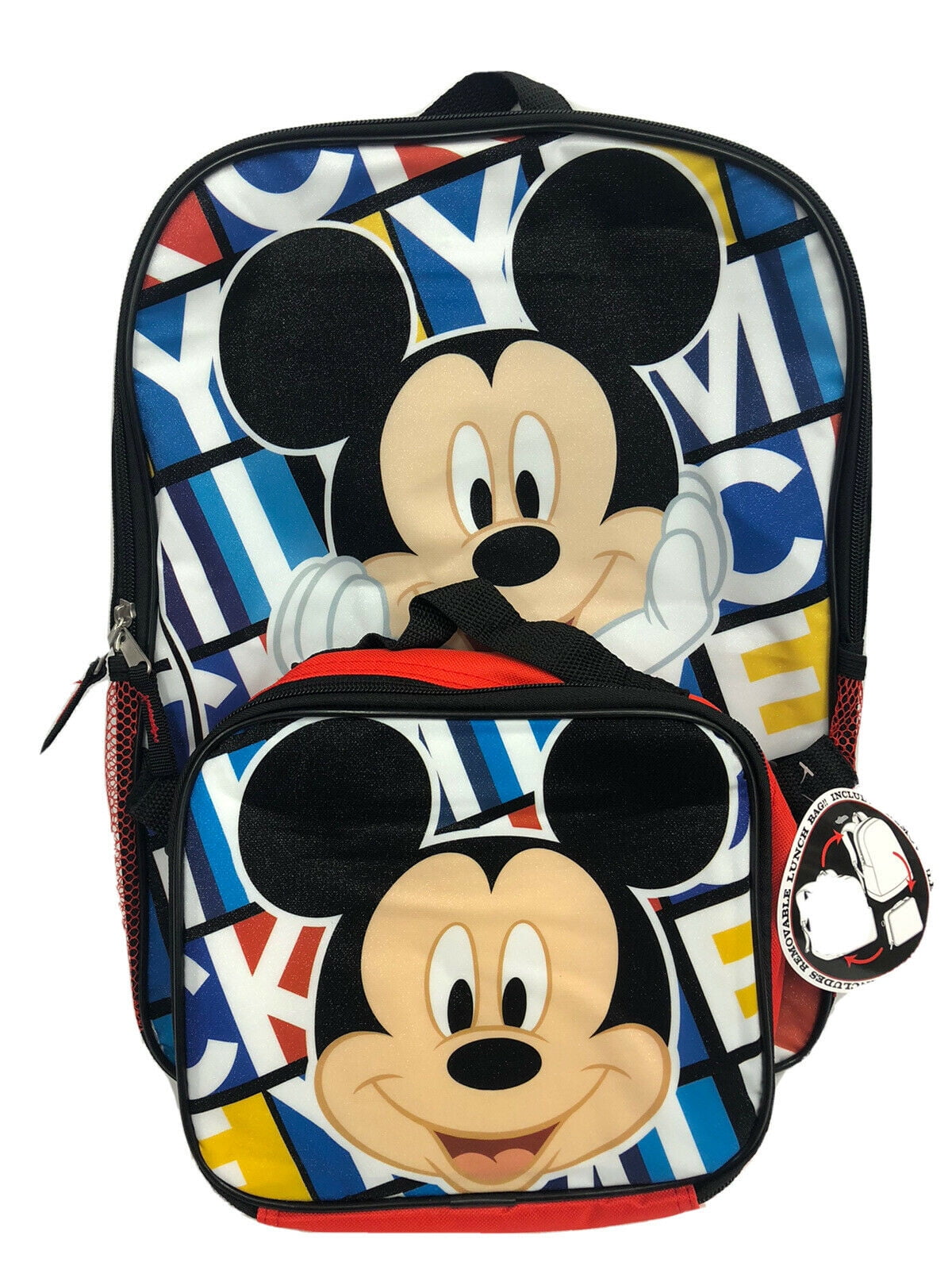 Disney Mickey Mouse 16" Backpack with Lunch Box Zippered main compartment Side mesh pocket for water bottle or accessories backpack: 16”H x 12”W x 5”D Lunch bag 9 in(W) X 7.5 in(H) X 3.5 in(D)Disney Mickey Mouse 16" Backpack with Lunch Box