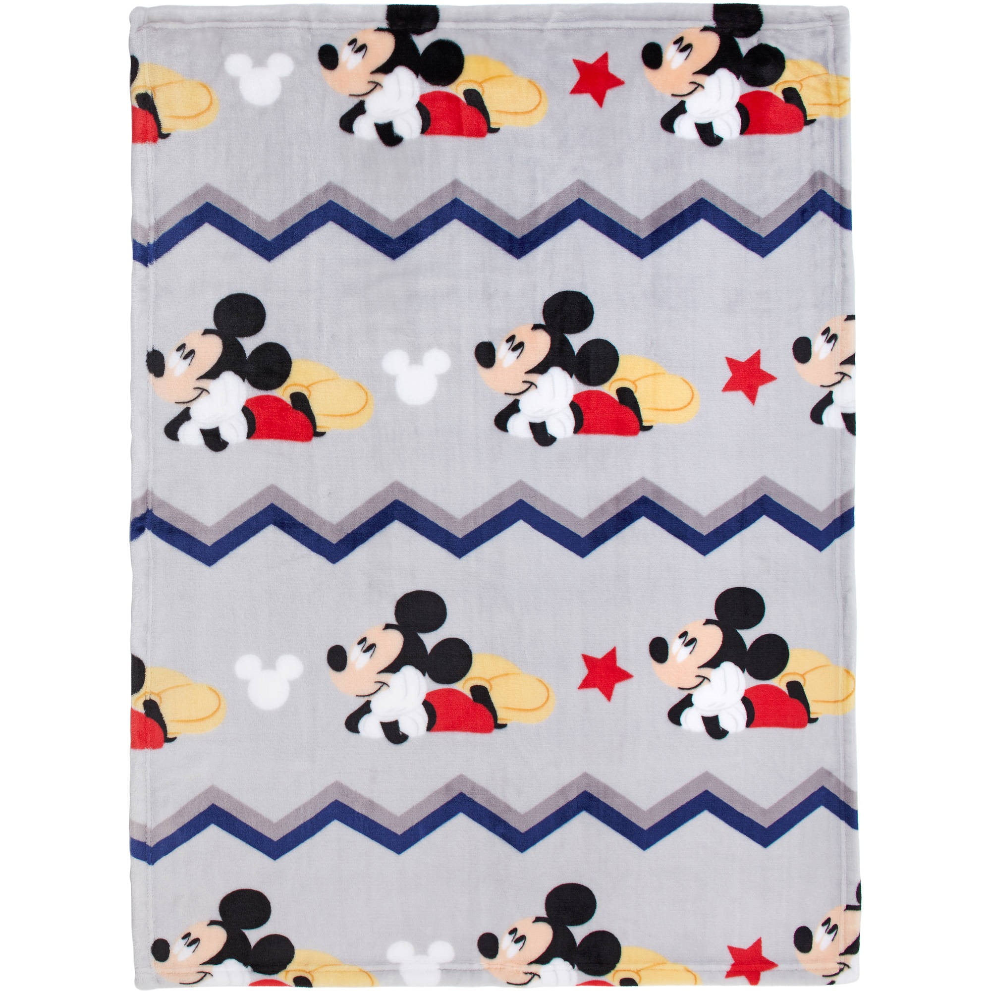 Soft, cozy and super snuggly, the Mickey Let’s Go II Fleece blanket will wrap your baby in plush softness. It features lovable Mickey Mouse amidst navy chevron stripes on a gray background.