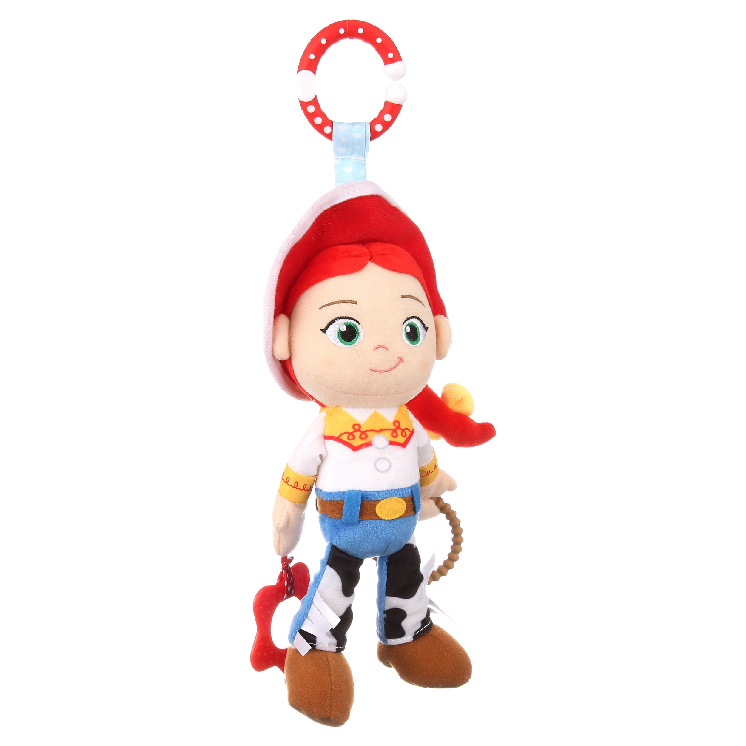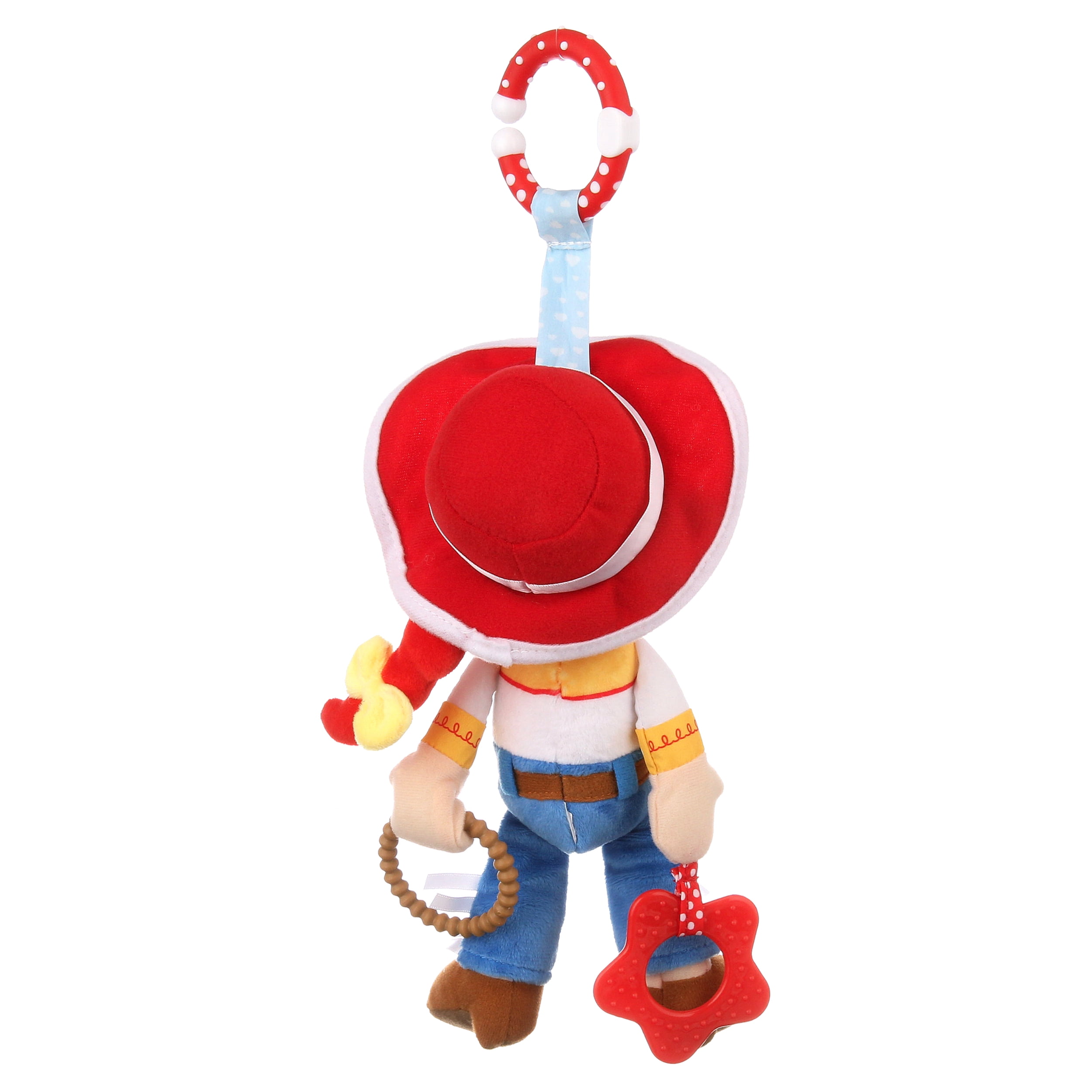 Ready for a rootin’ tootin’ good time Disney•Pixar Toy Story Jessie Activity Toy is just the thing to keep your little cowhand soothed and entertained. Lasso ring teether will soothe developing teeth and gums while the crinkle, squeak and chime sounds will entertain and delight! Jessie is sure to stay close and hand with the on-the-go clip for attaching to strollers, car seats, and more as she totes along on all the wild west adventures you can throw her way! Dressed in her classic red hat, red hair and yellow bow to her cow print chaps and boots, she is cowgirl through and through and sure to become a best friend for your little one.