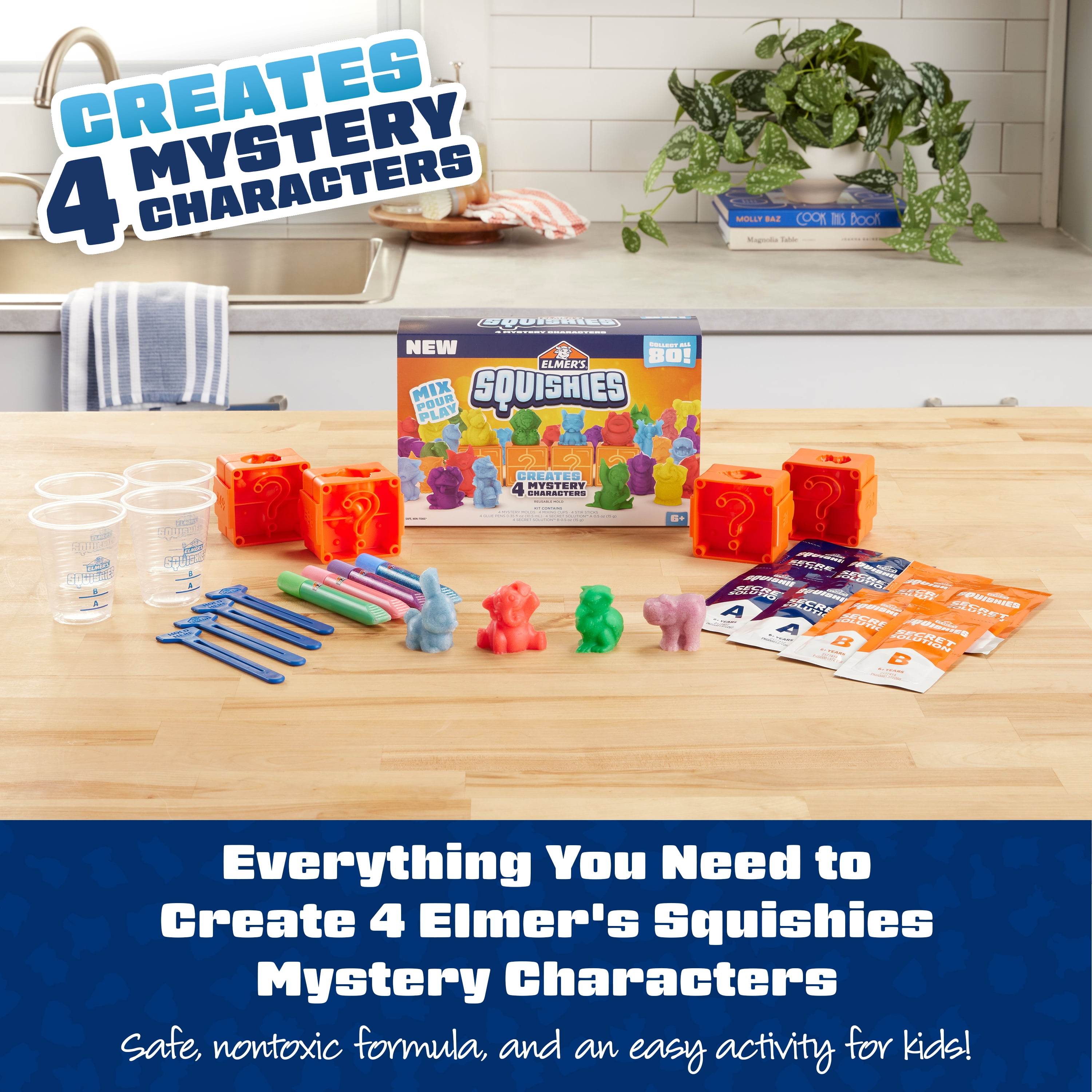 - Mix, pour, and play with your Elmer’s Squishies mystery characters in 60 minutes!