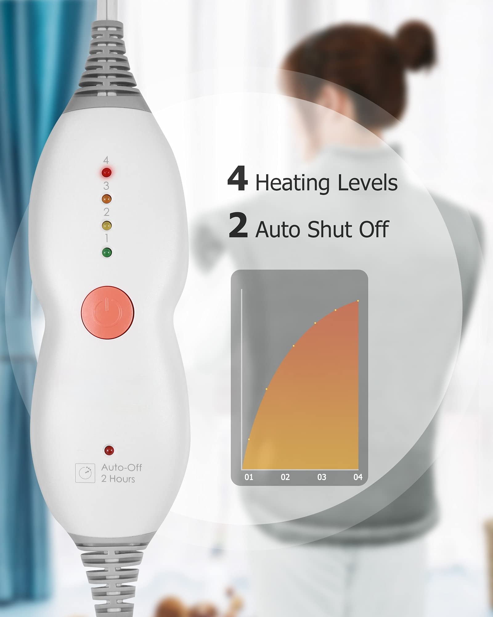 3. The heating pad features 4 heat settings to deliver the personalized level of comfort you need. The long power cable (6 ft) allows you to move around freely while relaxing with the wrap. Auto-off after 120 minutes helps you conserve energy and prevents overheating.