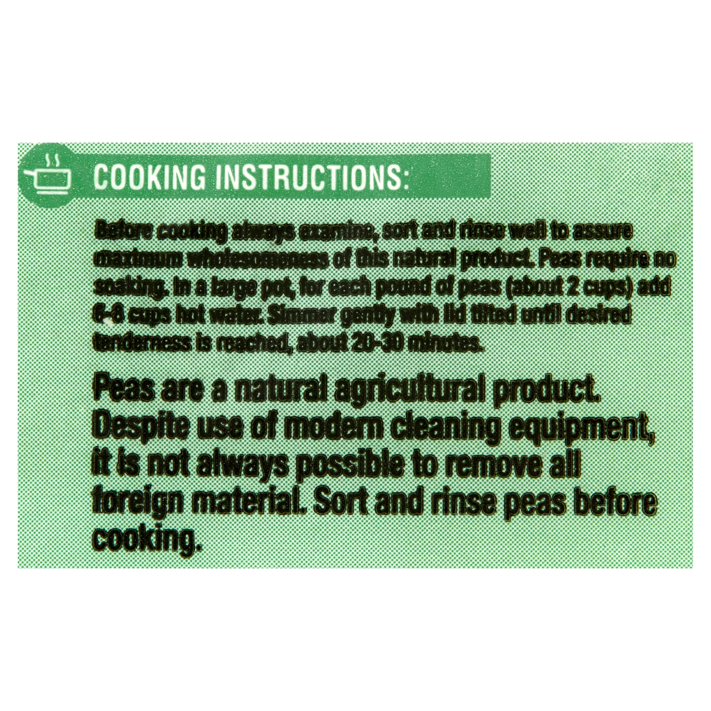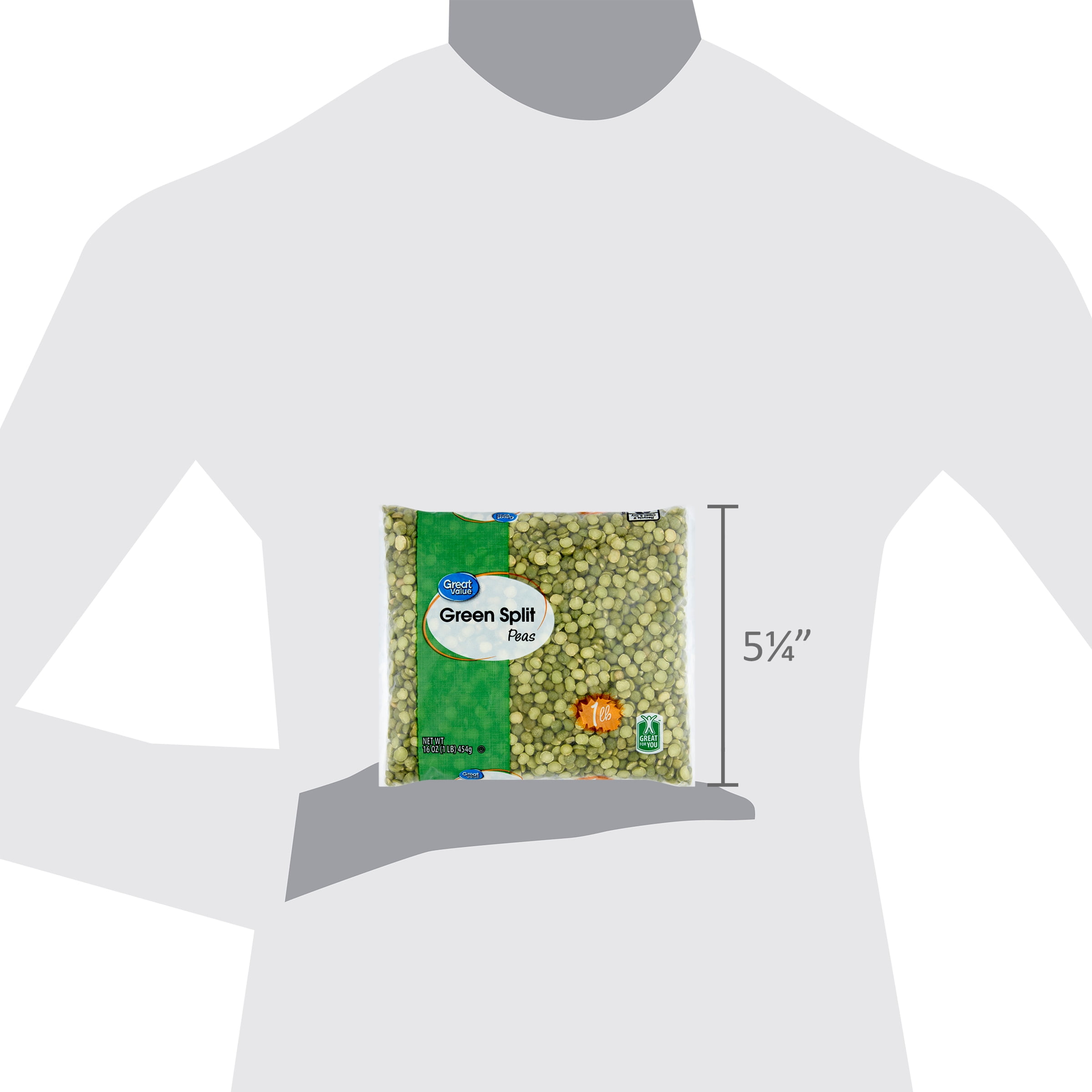 Great Value Green Split Peas have a smooth texture and a delicate mild flavor that are great in dozens of dishes. Use them to make split pea soup, stews and other delicious recipes, or choose to simply enjoy them as a side dish. Make it a meal and serve prepared peas with meat loaf and a side of mashed potatoes. These peas are an excellent low calorie source of protein. They also offer additional nutritional benefits as they are a great source of dietary fiber and iron. This bag comes with one pound of peas making it easy to stock up. Enjoy the wholesome taste of Great Value Green Split Peas.