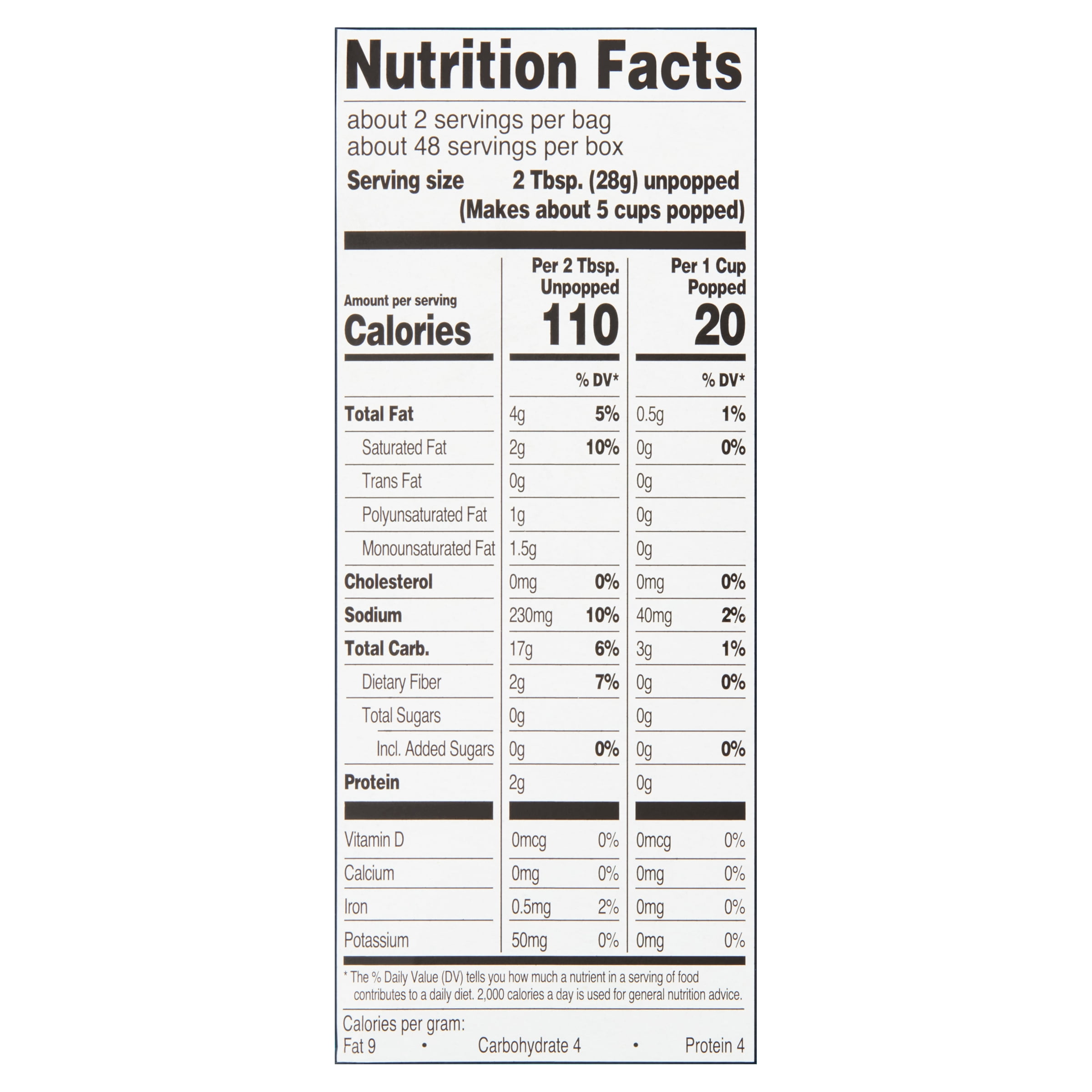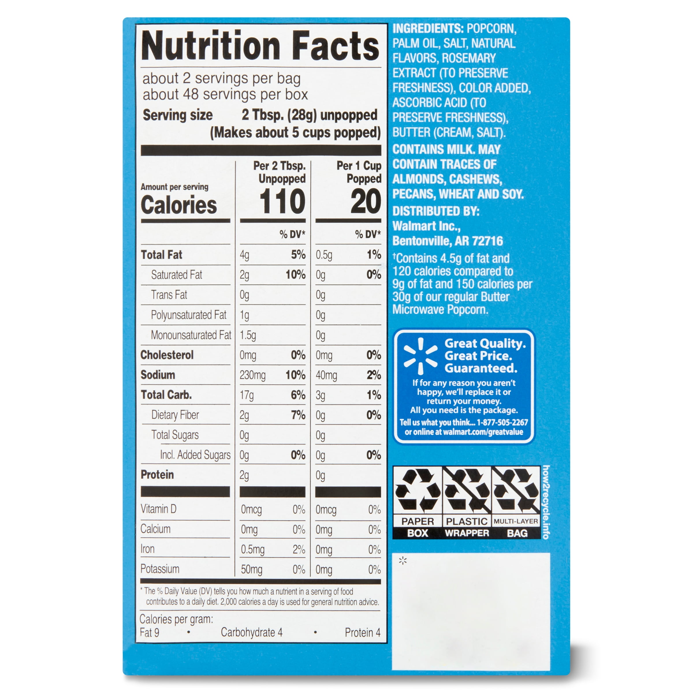 The delicious flavor of Great Value Light Butter Flavored Microwave Popcorn is the perfect balance of light butter and salt, making it an irresistible option for popcorn lovers everywhere. Hot from the microwave in minutes, our popcorn melts in your mouth. Made with 100-percent whole grains and no artificial flavors or preservatives, this snack is a high-quality family treat. With 150-percent less fat than our regular butter microwave popcorn and zero grams of trans fat, Great Value microwave popcorn is a wise choice for school, work, or on the go. There are 24 bags that are easy to prepare and easy to enjoy. Treat yourself and your family to popcorn perfection with Great Value Light Butter Flavored Microwave Popcorn.