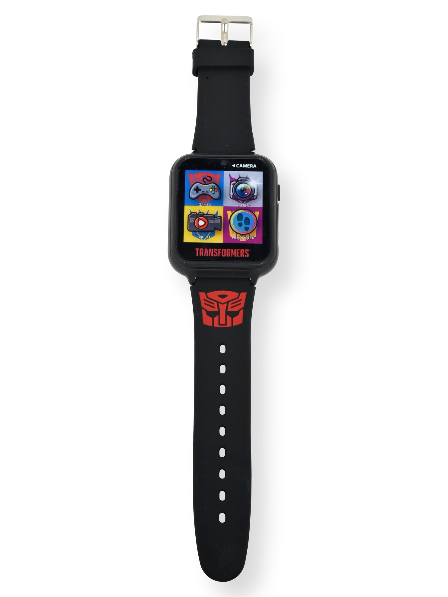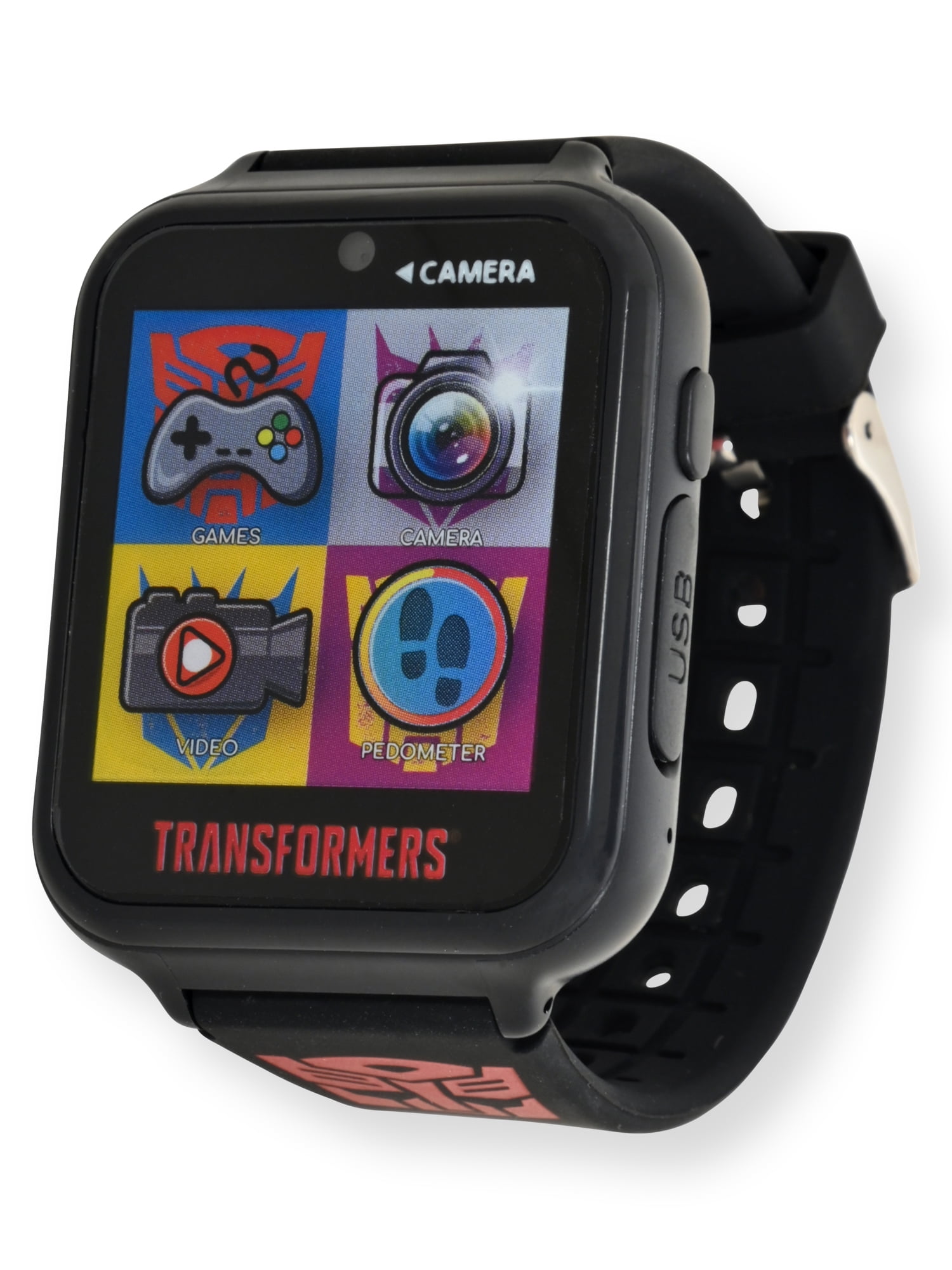 Watch Transformers iTime Unisex Kids Interactive Smartwatch – Model# TFC4025WMC is the first of its kind, integrating your child’s favorite characters with the fun and excitement of technology. This kids licensed Smartwatch for boys or girls is an interactive watch that features 10 character clock faces (5 digital and 5 analog); 6 fun touch-activated games; a front facing selfie camera and viewer for taking and viewing photo and video; a voice recorder; a fitness tracker to track your steps, calories and distance; three changeable wallpapers; a basic arithmetic calculator; and time tools such as an alarm with three custom alarm tones, a timer, and a stopwatch! Makes a great gift for your Transformers fan. Included is a standard micro-USB cord for charging and transferring photos*, videos and voice notes to your computer. *Windows only. No third party connectivity or Bluetooth Capabilities for added protection.Watch Transformers iTime Unisex Kids Interactive Smartwatch – Model# TFC4025WMC