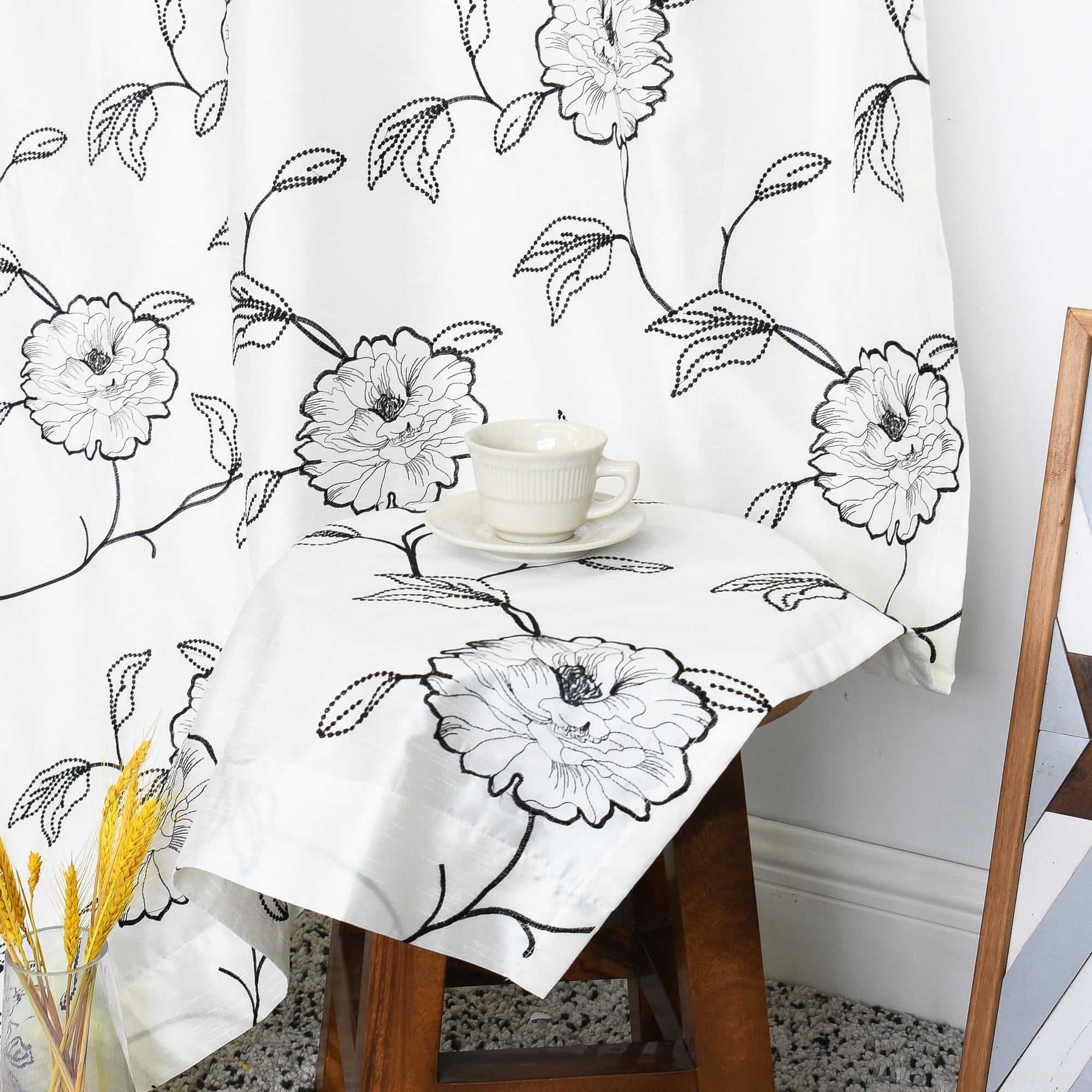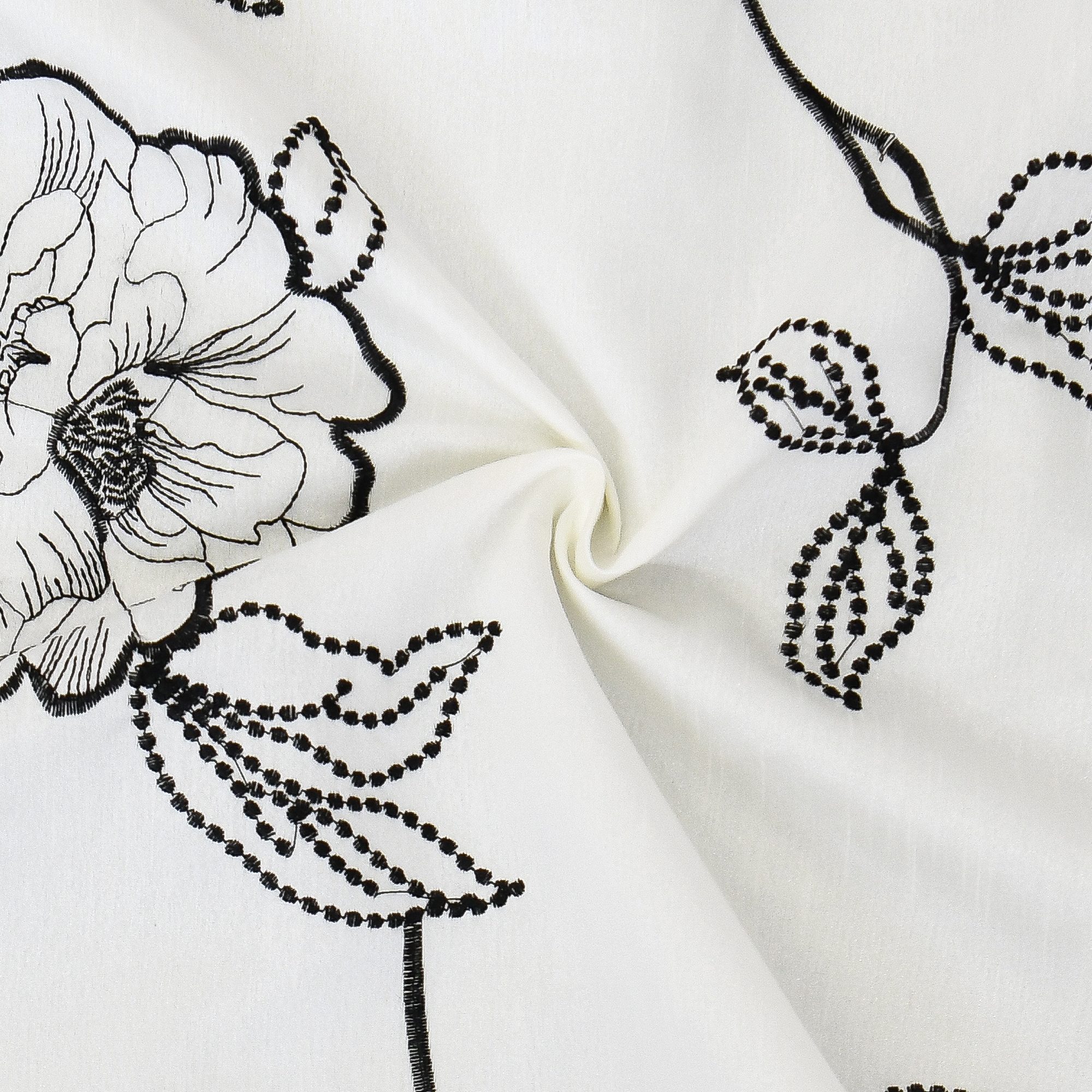 - Each curtain has been designed with precision and elegance in mind. The beautiful cream faux silk polyester base shimmers in the right lighting, accentuating the detailed black embroidered Magnolias.