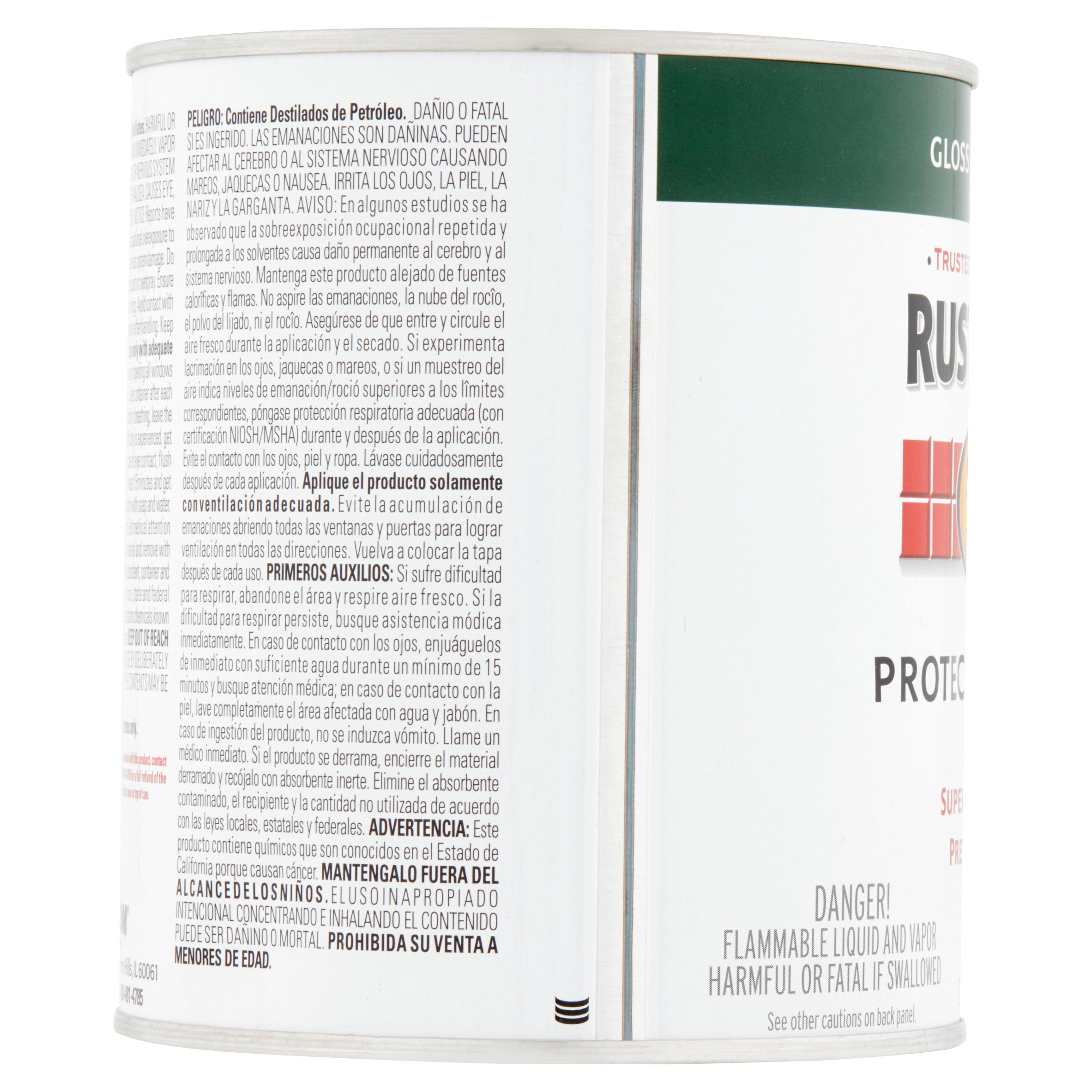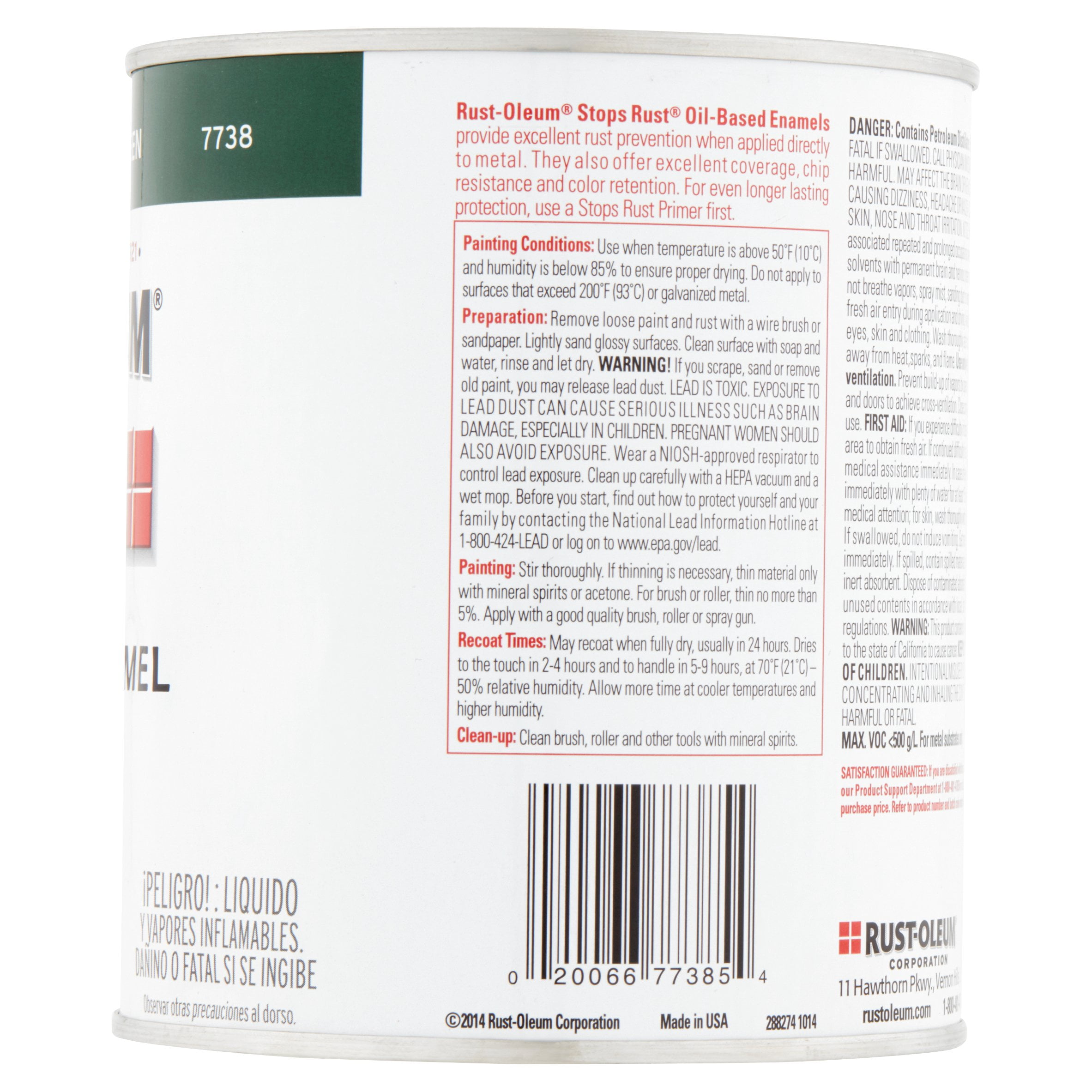 Hunter Green, Rust-Oleum Stops Rust Gloss Protective Enamel-7738502, Quart: Provide a durable protective coating for all your indoor and outdoor projects. The rust-preventative formula offers excellent resistance to abrasion, fading, chipping and dulling. Paint dries to the touch in 2-4 hours and applies easily, covering between 50-90 square feet per quart. Not for use on galvanized steel,