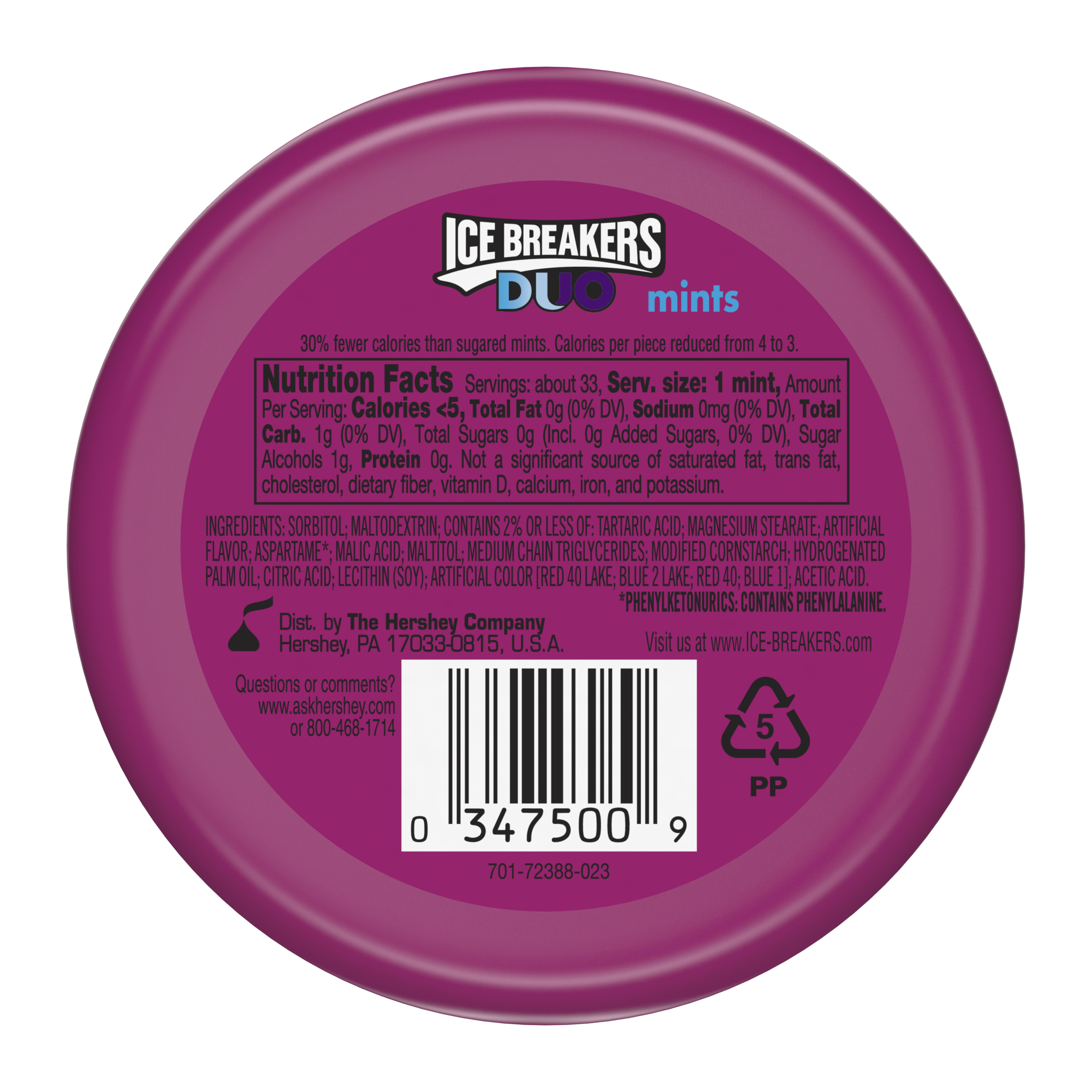 Sweeten your breath with the cooling taste of Ice Breakers Duo Grape Mints. Each delicious piece combines the sweet fruity taste of grape with refreshing cooling crystals.