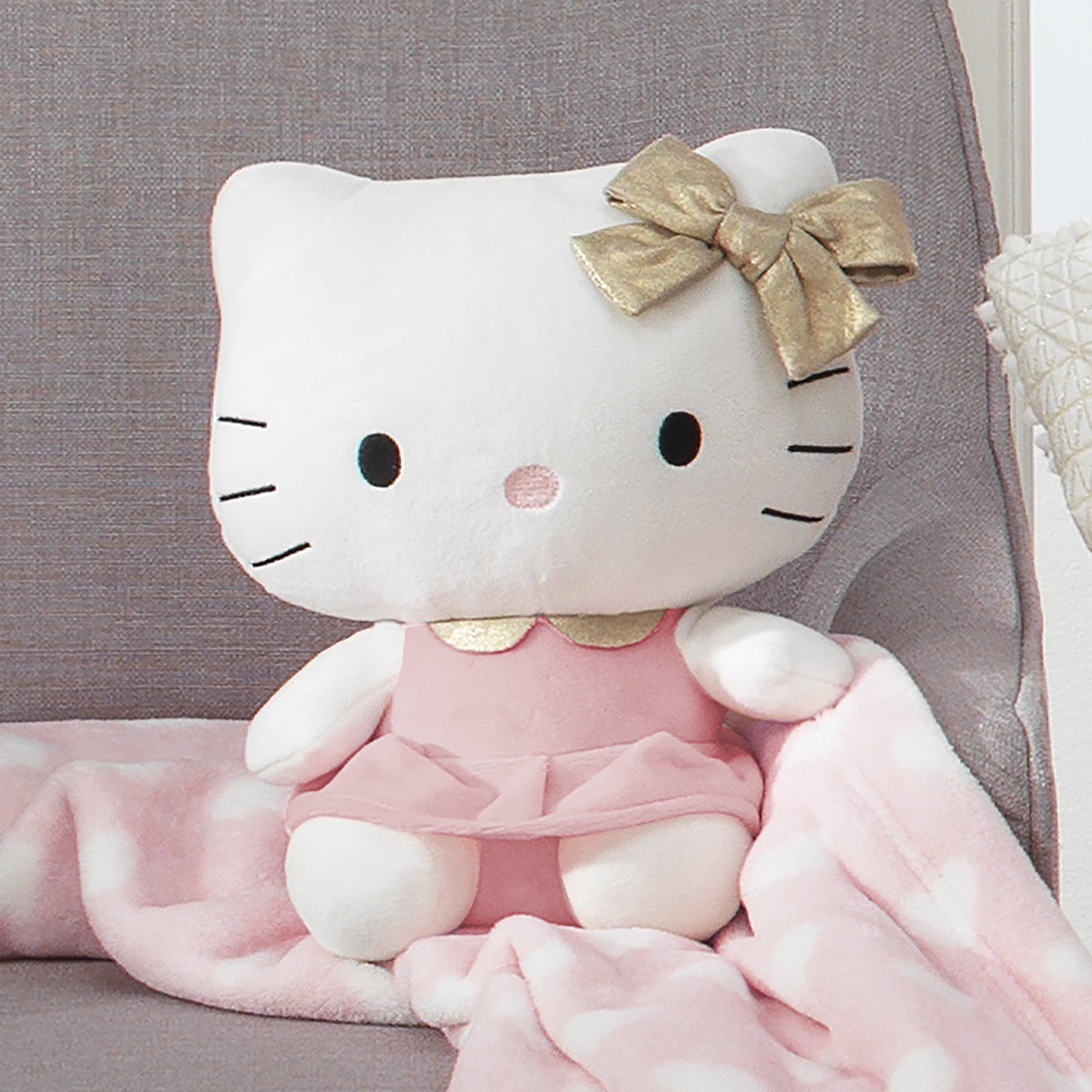 The perfect accessory for your little one is a Hello Kitty plush. Soft and sweet she is 10" tall, has a white velour body, wears her favorite pink velvet dress and has a dimensional metallic gold bow. 100% polyester. Imported. The perfect accessory for your little one is a Hello Kitty plush Soft and sweet she is 10" tall and has a white velour body.