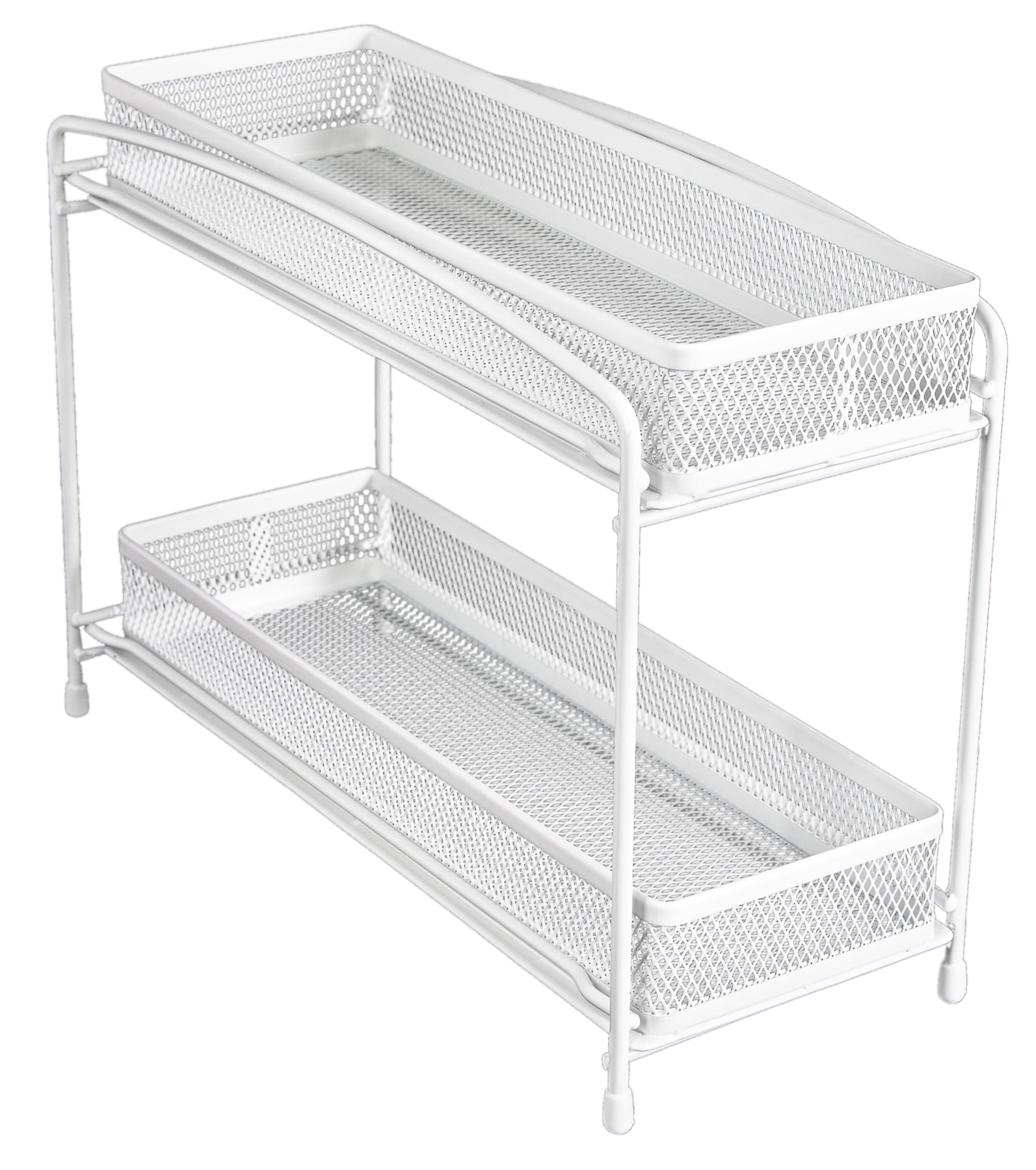 The Mainstays 2-Tier Pull-Out Spice Organizer helps keep your countertops organized and your favorite spices on hand to make your daily meal preparations easier than ever. Featuring white steel mesh baskets connected to a matching white steel frame, this spice organizer offers style on top of functionality. Its two drawers are designed to pull out from the rack, providing quick and convenient access to your most used seasonings and keeping them concealed in a more compact space when not in use. You can even bring one of these organizers into the bathroom to keep your lotions, cleansers, wipes and other hygienic items all in one place, or put one in your craft room to keep all your threads, brushes, and paints together. Running a tidy home is made easy with this Mainstays 2-Tier Pull-Out Spice Organizer.