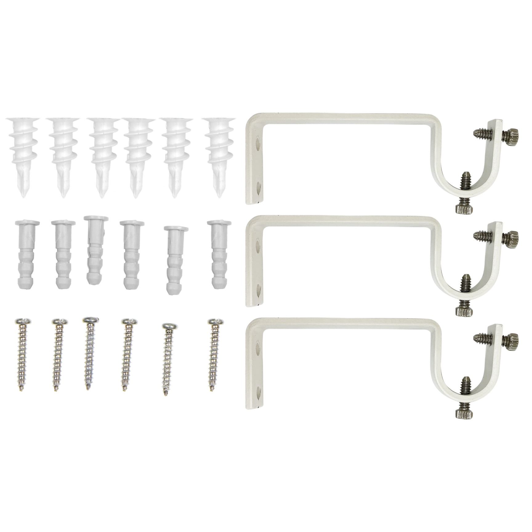 - 6 screws, 3 brackets, 2×6 anchors, 3 rods, 2 finials