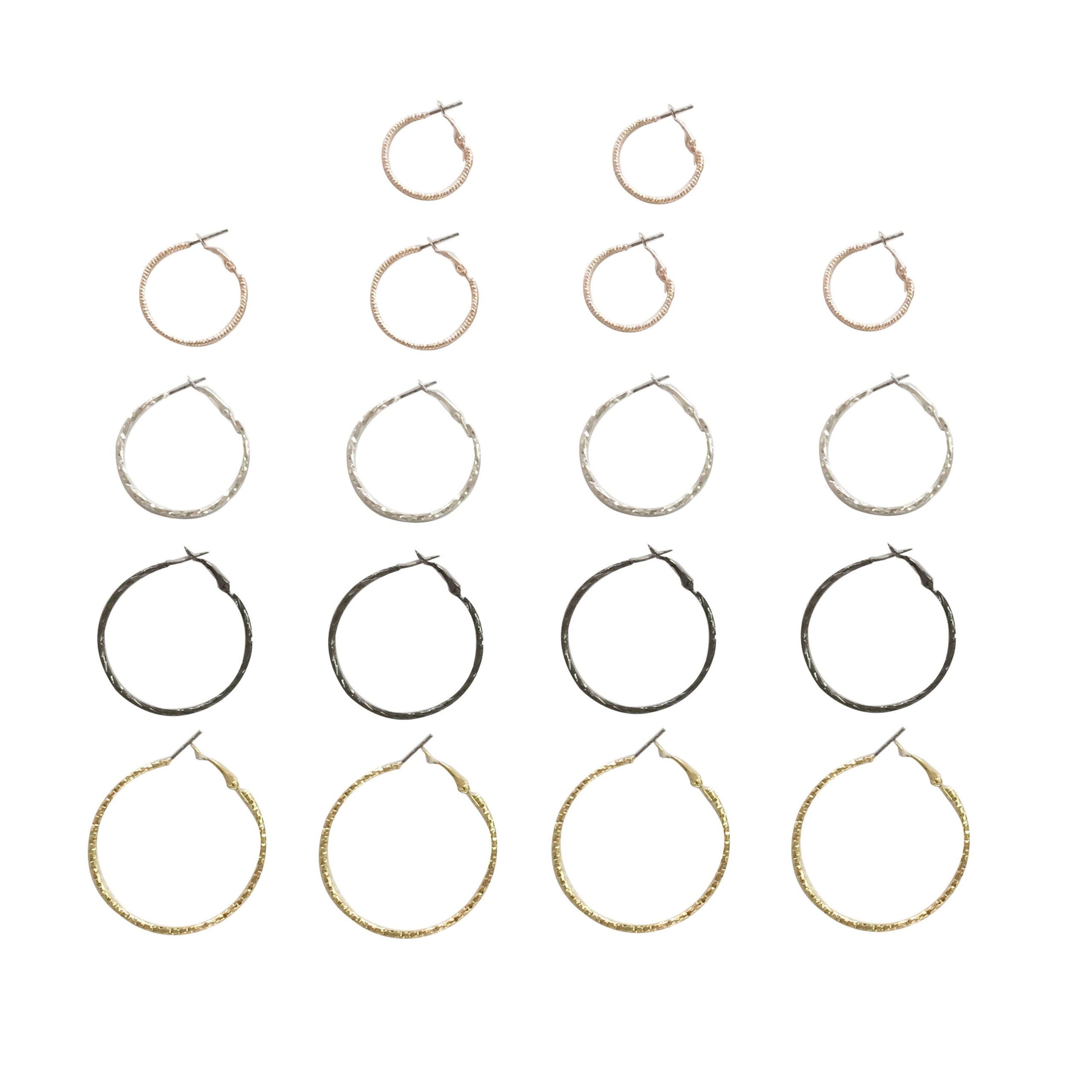 With 9 pairs, this hoop set is a great value! Caution: Not intended for use by children under 14. This product is intended for adult fashion and decorative use only. Do not put items in mouth or ingest.Mixed Plate Textured Hoop Earrings