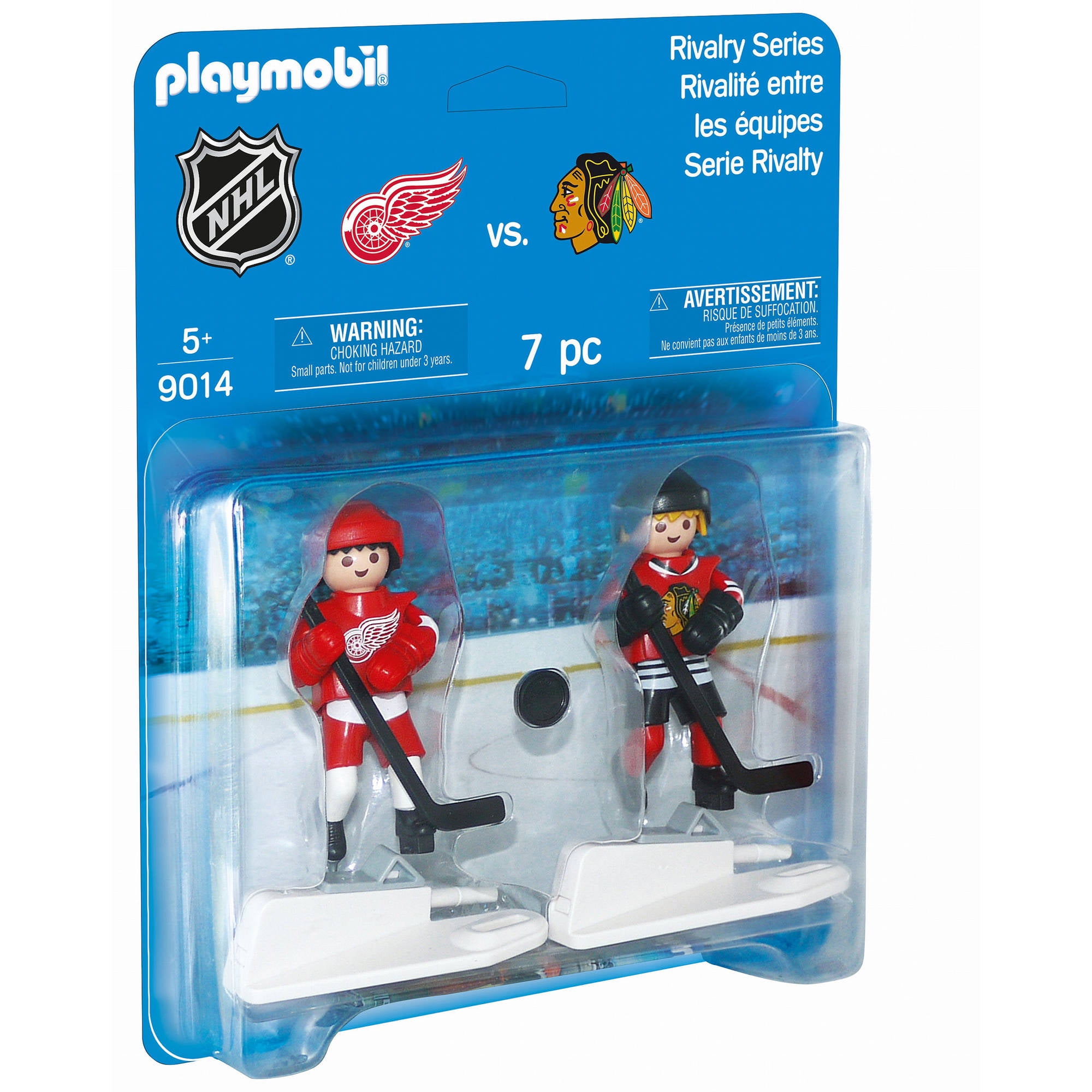 Face off with an epic rivalry match between the Chicago Blackhawks and Detroit Red Wings. Simply pull back each players lever to move the hockey stick and fire the puck across the rink. Set includes one Blackhawks player, one Red Wings player, puck, and jersey number decals for added customization. Use the figures on the NHL Hockey Arena (5068 sold separately) for added fun! Recommended for ages five and up. Warning. Choking Hazard. Small parts. Not for children under 3 years.