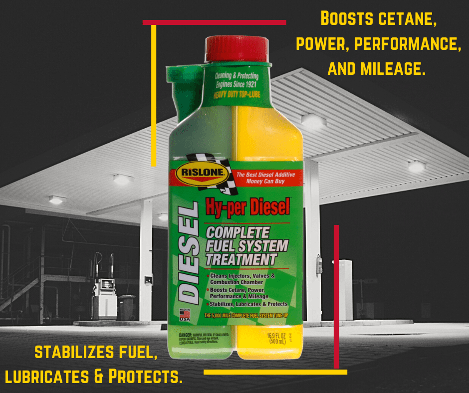 Rislone® Hy-per Dieselâ„¢ Complete Fuel System Cleaner improves the quality of Diesel fuel by increasing its cleaning ability, adding lubrication, removing contaminants, fighting corrosion, and helping to prevent the fuel from gelling & going bad. This one dual cavity bottle contains the same amount of additives equal to a bottle of regular injector & complete fuel system cleaner, anti-gel cold flow improver, fuel stabilizer & conditioner, Cetane booster & diesel treatment, ULSD sulfur substitute, and UCL pump & injector lubricant. Simply put, it is the best all in one diesel fuel additive money can buy.