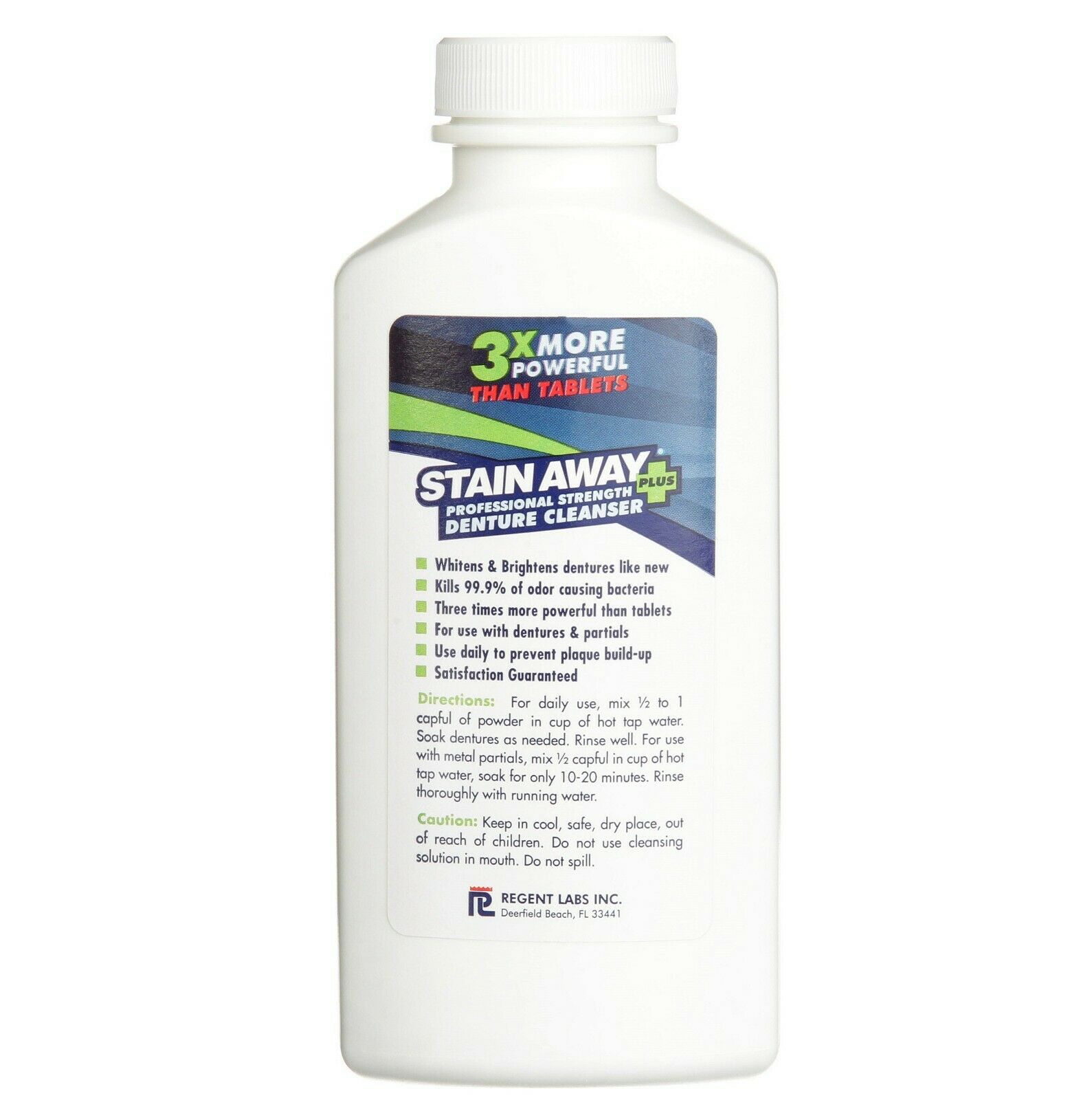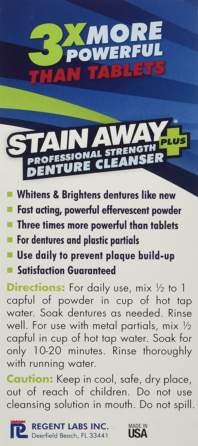 Super strength cleanser.Denture CleanserRegent LabsFor daily use, mix 1/2 to 1 capful of powder in 1/2 cup of hot tap water. Soak dentures. Rinse thoroughly. For heavy stains, mix 2-3 capfuls in 1/2 cup of hot tap water. Soak for 20-30 minutes or overnight as needed. Rinse.Uses:Whitens & brightens dentures like new. Fast acting, powerful effervescent powder. Three times more powerful than tablets. Recommended for full dentures only. Use daily to prevent plaque build-up. Clean, minty-fresh taste.Keep in a cool, dry place out of reach of children. Do not use in mouth.