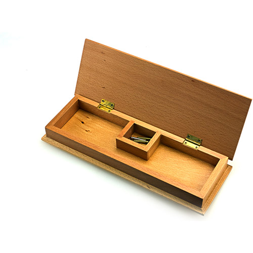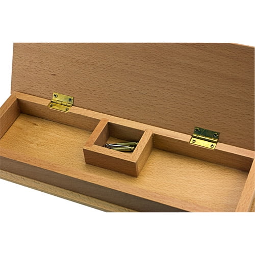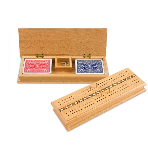 The cribbage set lid is designed to be opened as a folding cribbage board with card storage inside, which fits two decks of cards and the metal cribbage pegs. Playing cards not included.