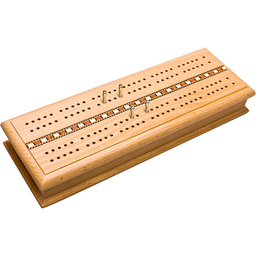 A deluxe two track cribbage board with unique Italian inlaid board with card storage and metal cribbage pegs